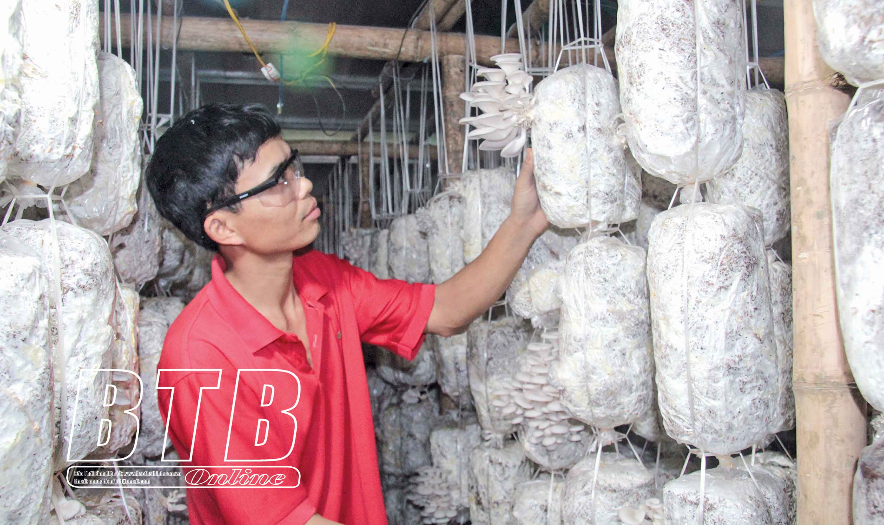 Đảng viên trẻ Lại Hoàng Tuyển thành công với mô hình trồng nấm sò.
