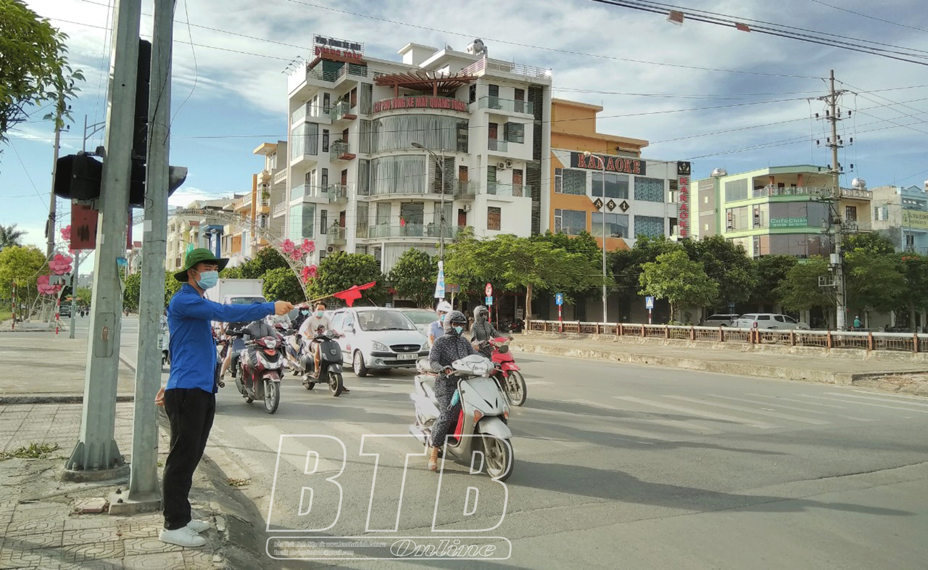 Thanh niên tình nguyện Trường Đại học Thái Bình tham gia điều tiết giao thông trên đường Lê Quý Đôn (thành phố).