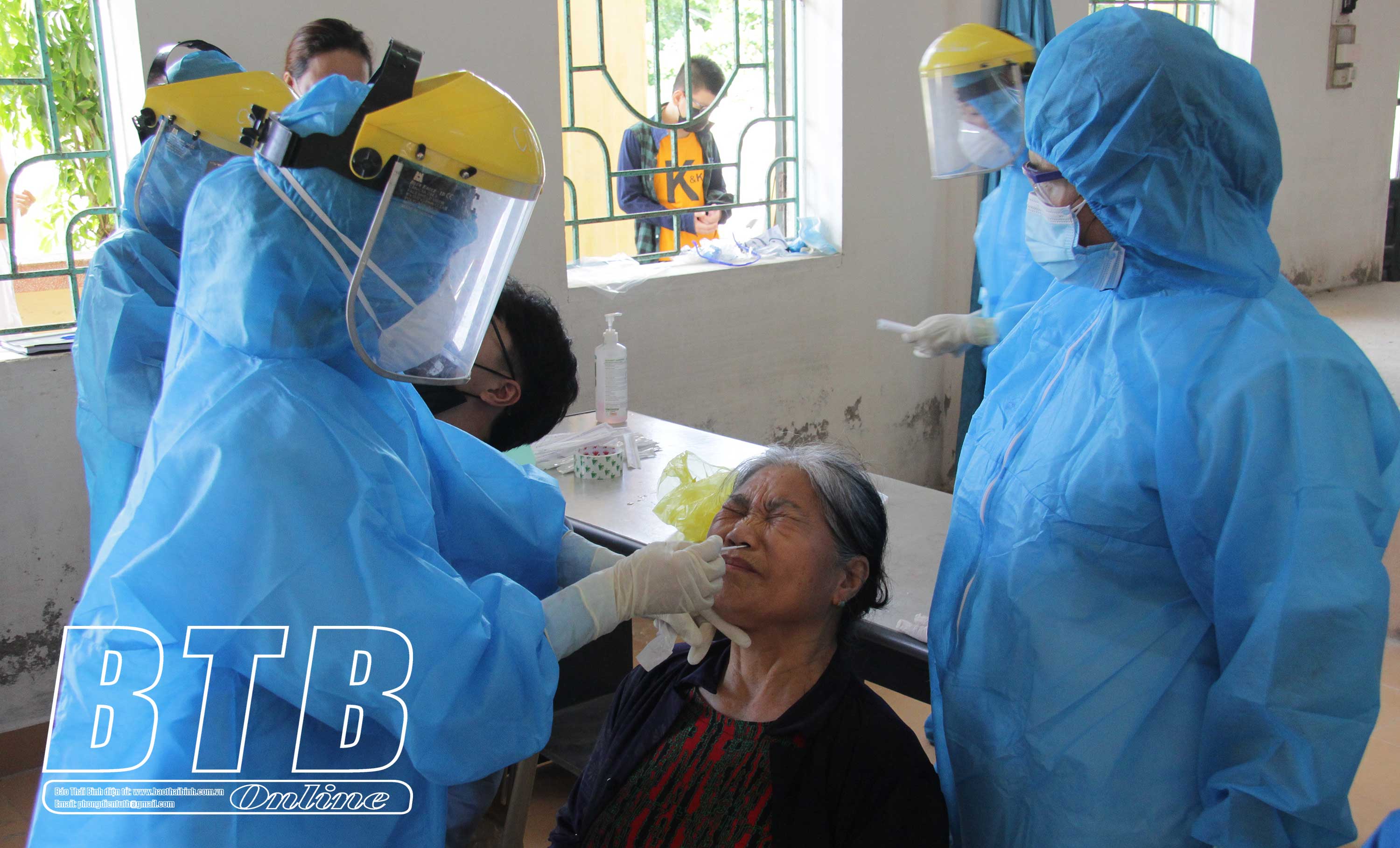 Thực hiện lấy mẫu xét nghiệm cho trường hợp liên quan đến ca dương tính với SARS-CoV-2 tại thôn Thanh Lâm, xã Đông Minh (Tiền Hải)
