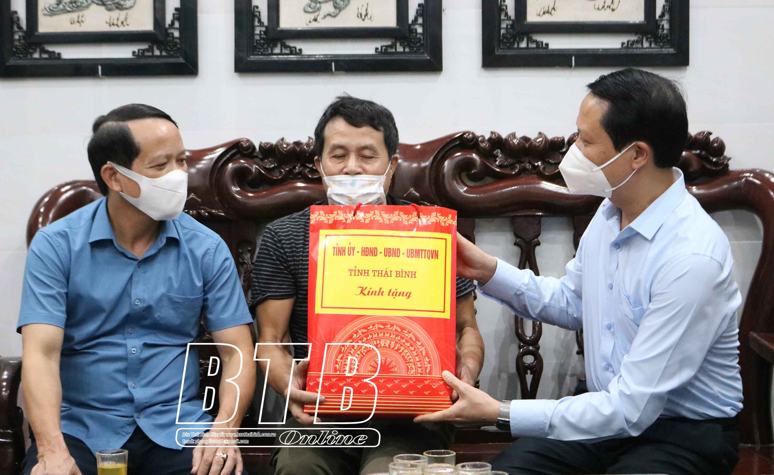 Đồng chí Hoàng Thái Phúc, Ủy viên Ban Thường vụ Tỉnh ủy, Trưởng Ban Nội chính Tỉnh ủy thăm hỏi sức khỏe ông Vũ Quang Long, bố liệt sĩ, bệnh binh, thôn Lê Xá, xã Quỳnh Hải (Quỳnh Phụ).