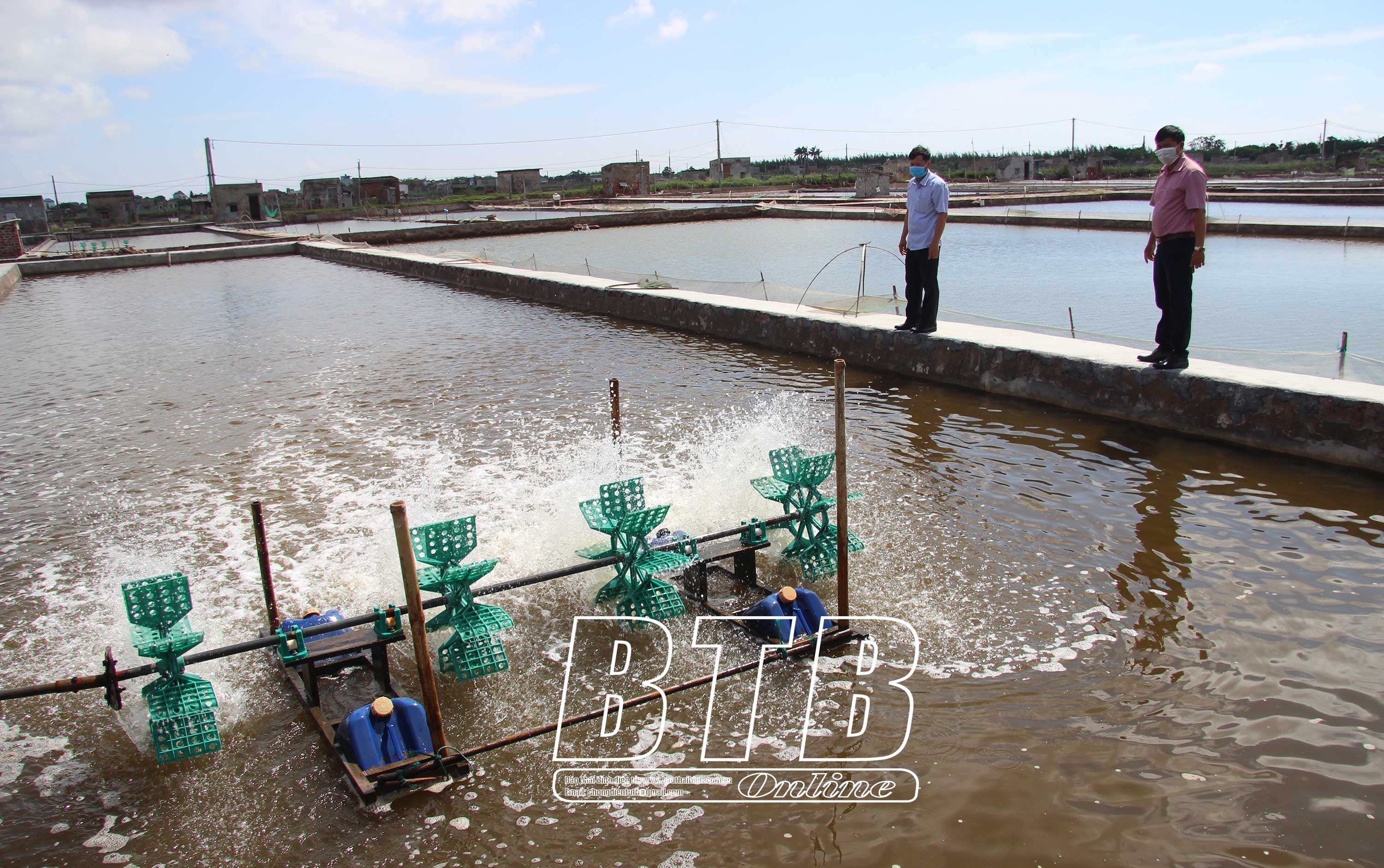 Diện tích nuôi trồng thủy sản của các hộ dân bị cách ly tại thôn Thanh Lâm, xã Đông Minh (Tiền Hải) được các đoàn thể trông coi duy trì sản xuất.