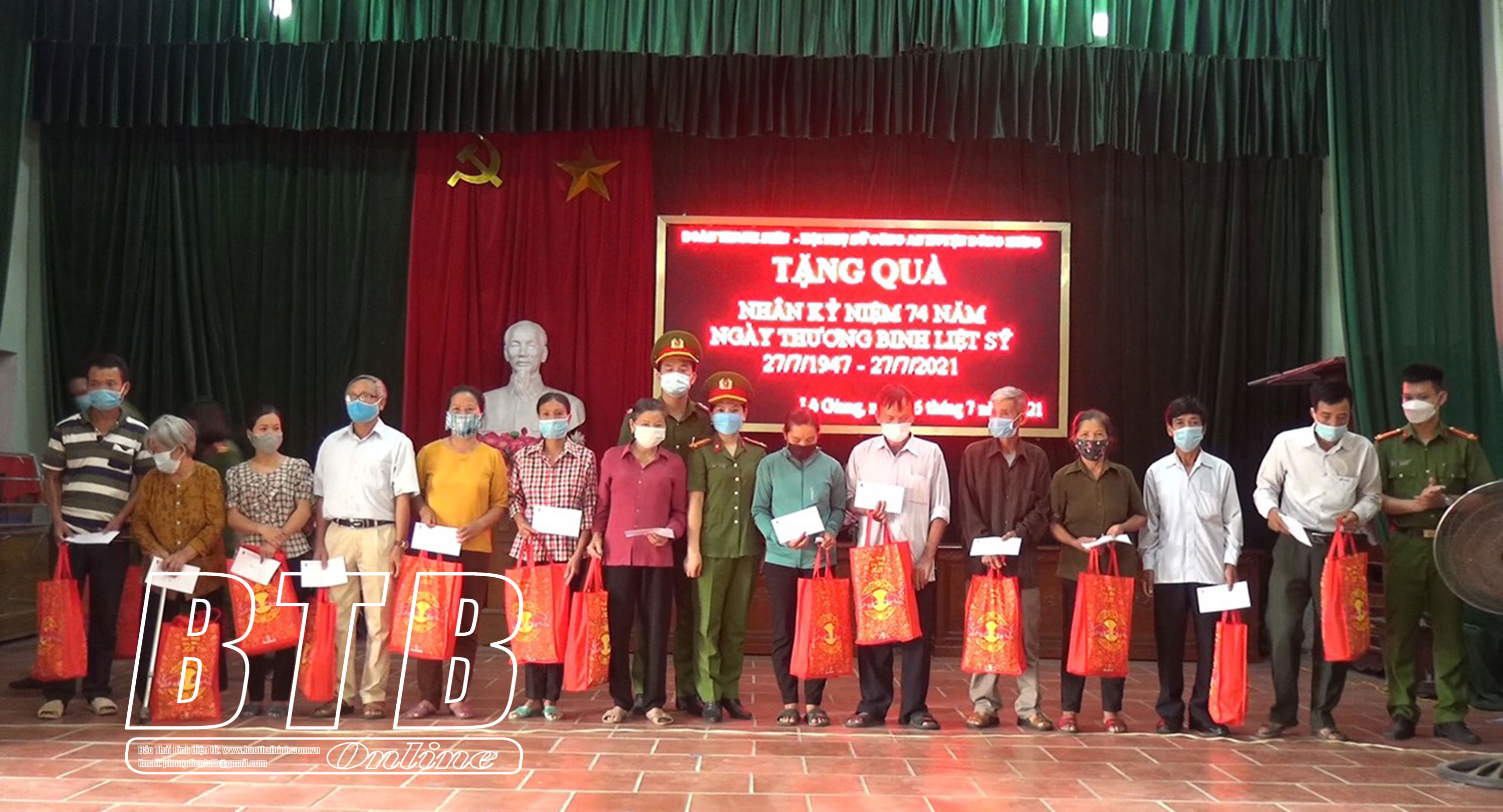 * Hội Phụ nữ, Đoàn Thanh niên Công an huyện Đông Hưng đã tổ chức thăm hỏi và trao tặng 60 suất quà với tổng trị giá 31 triệu đồng tới các thương, bệnh binh, nạn nhân chất độc da cam, các gia đình chính sách có hoàn cảnh khó khăn trên địa bàn 2 xã Đông Động và Lô Giang.