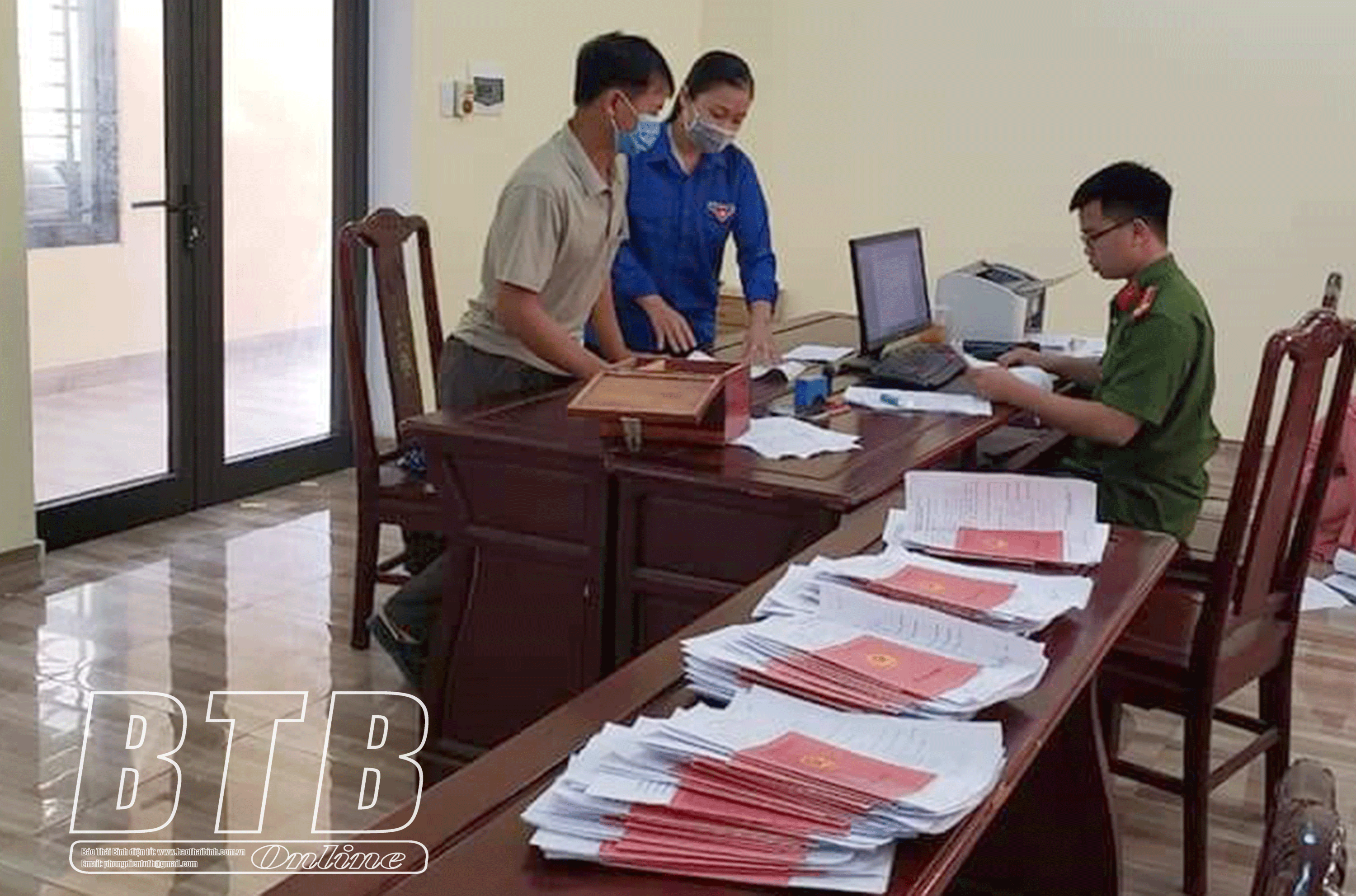 Đoàn Thanh niên thị trấn Kiến Xương hỗ trợ người dân làm thẻ căn cước công dân gắn chíp điện tử.