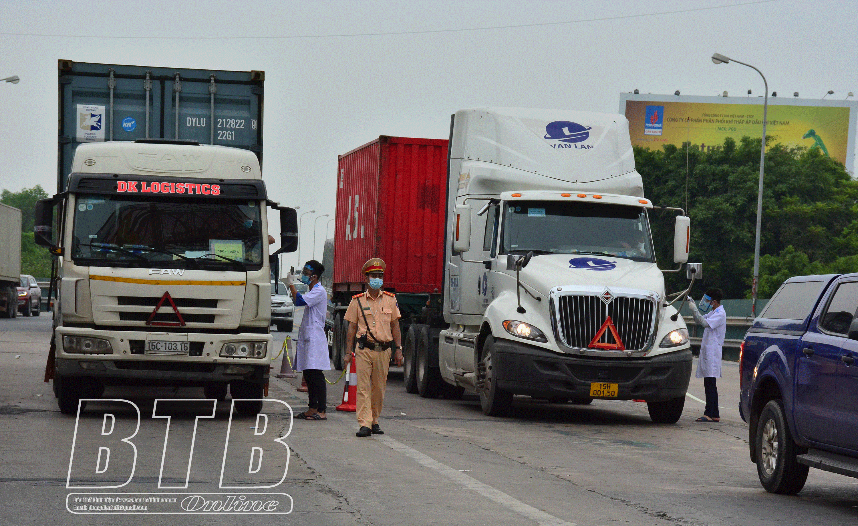 Sinh viên Đại học Y dược Thái Bình và lực lượng Công an làm nhiệm vụ tại chốt kiểm soát dịch cầu Tân Đệ.