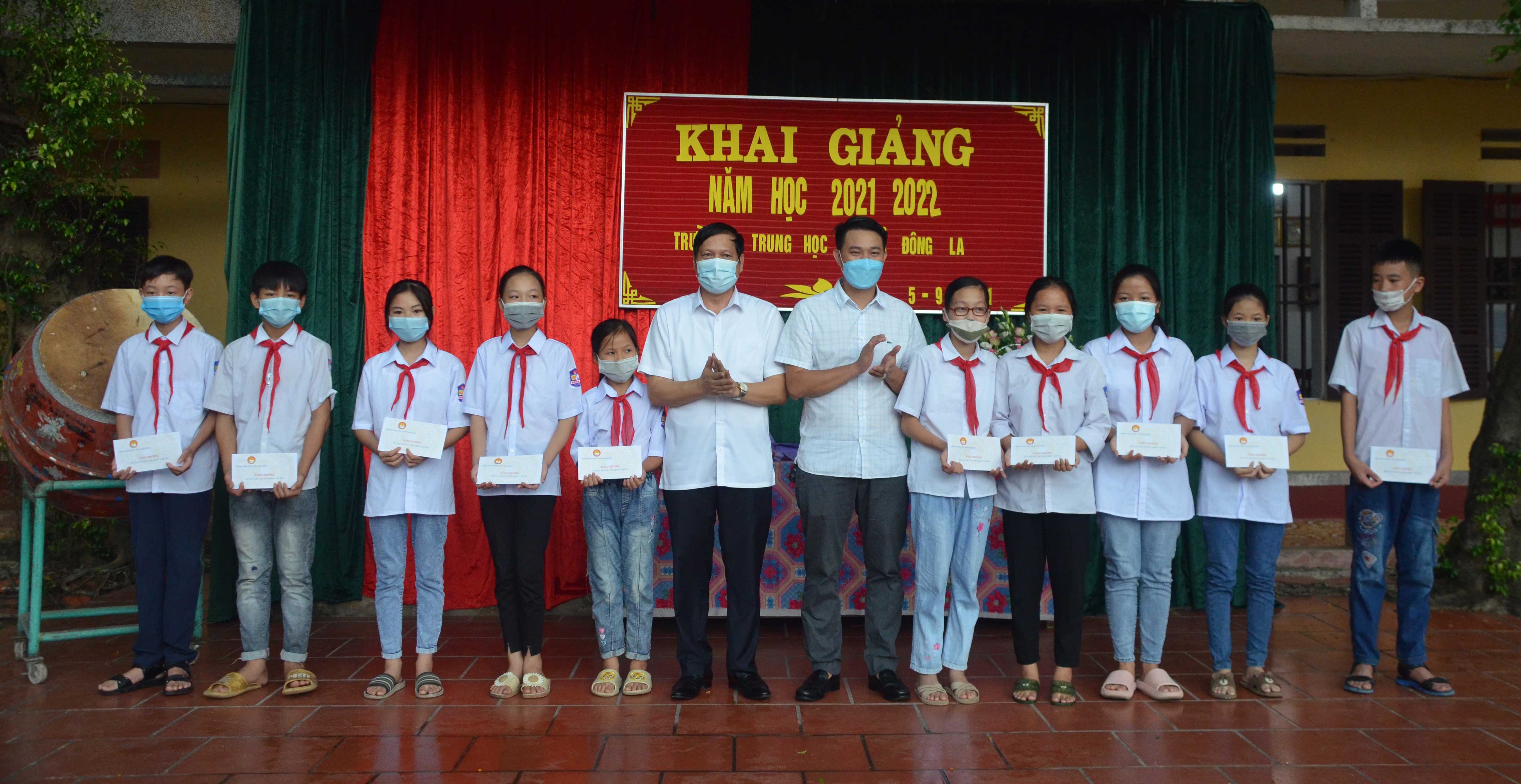 Đồng chí Vũ Mạnh Hiền, Chủ tịch Hội Khuyến học tỉnh trao học bổng cho học sinh Trường THCS Đông La (Đông Hưng).