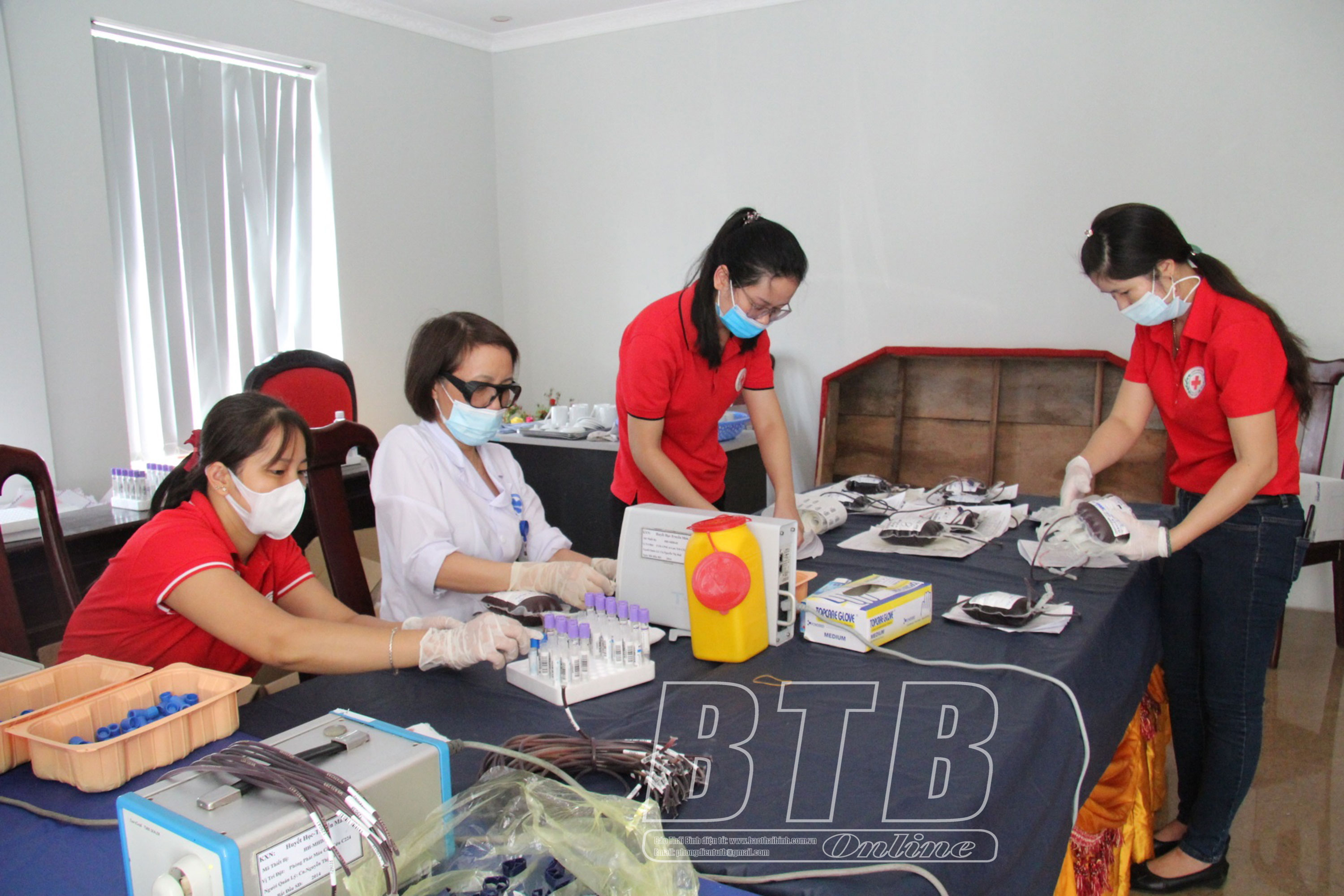 Kiểm tra, sàng lọc, phân loại máu trong ngày hội hiến máu tình nguyện tại huyện Hưng Hà.