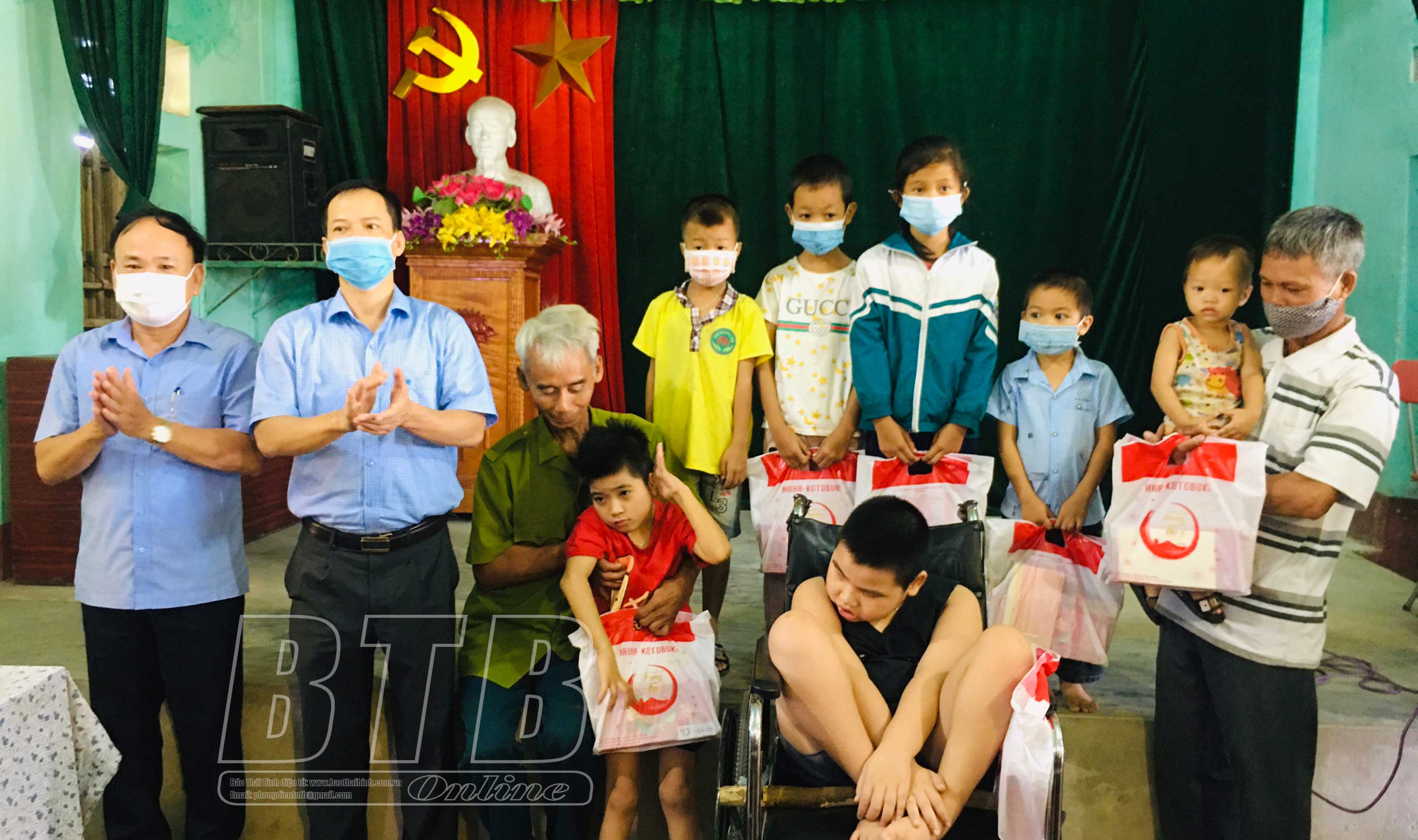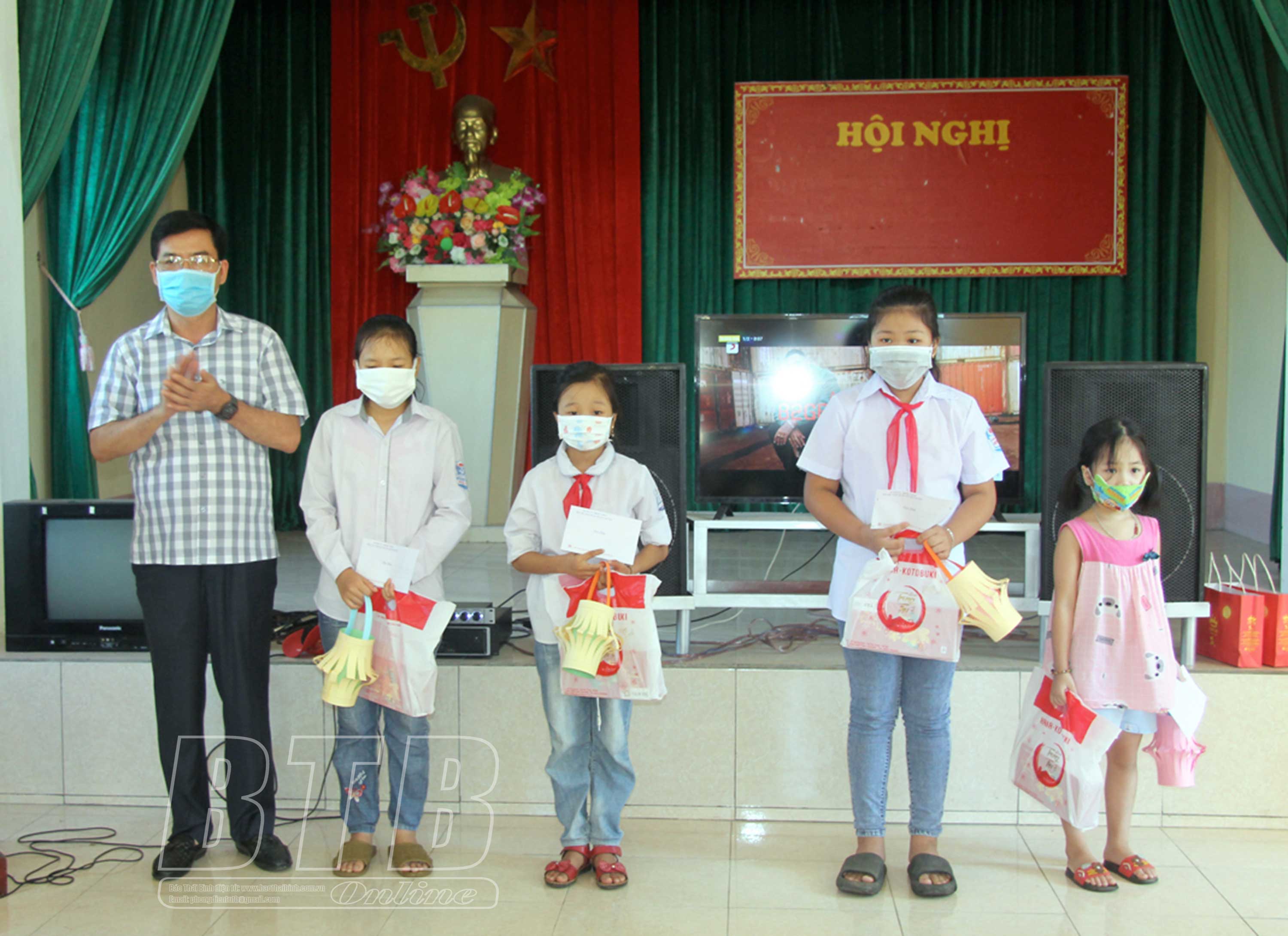 Đồng chí Đinh Trọng Xá, Tỉnh ủy viên, Bí thư Huyện ủy Quỳnh Phụ thăm, tặng quà các cháu thiếu niên, nhi đồng xã Đồng Tiến.