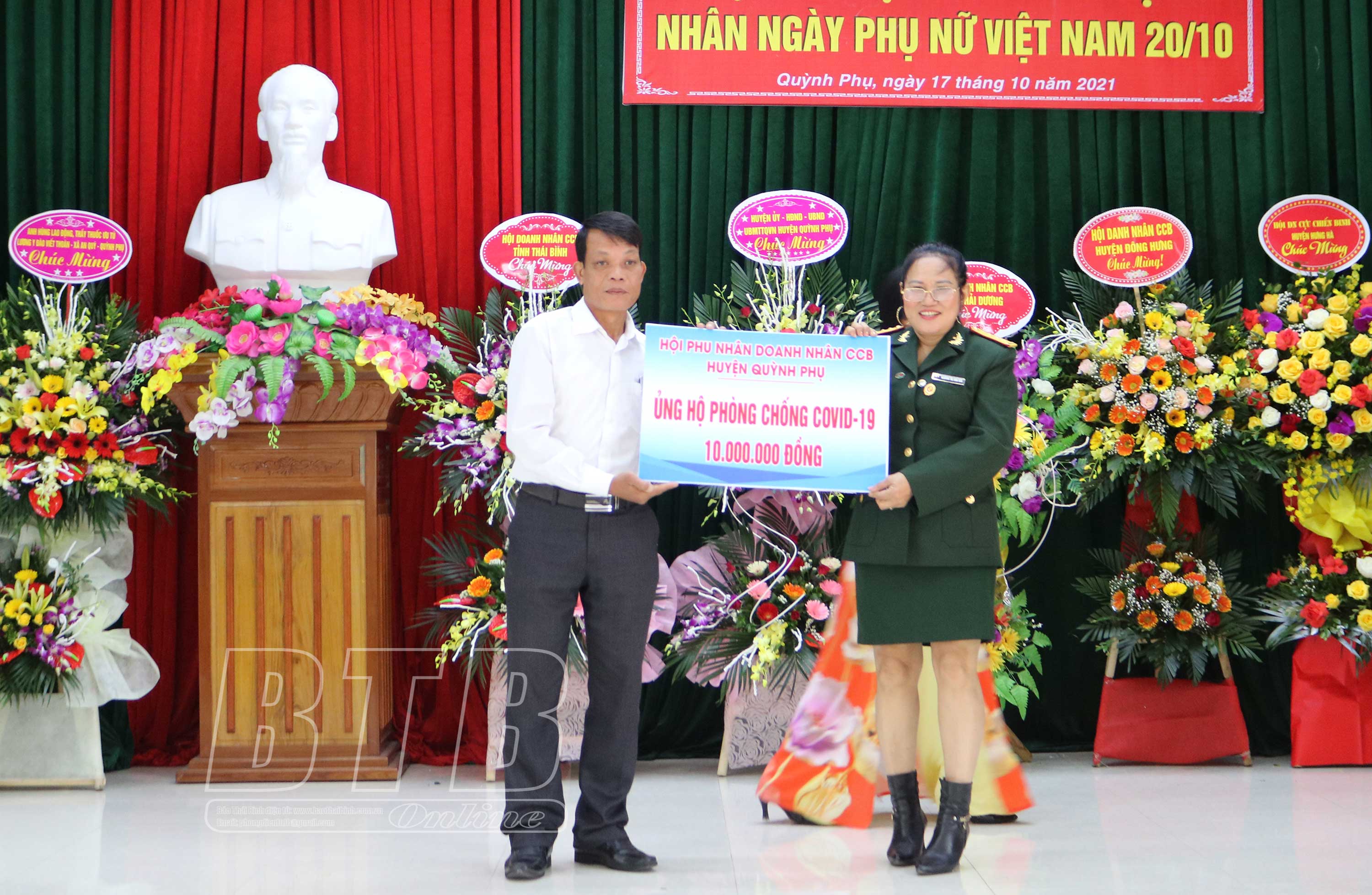Nhân dịp này, Hội Phu nhân doanh nhân CCB huyện Quỳnh Phụ đã quyên góp và ủng hộ quỹ phòng, chống dịch Covid-19 số tiền 10 triệu đồng, tặng quà, tri ân các hội viên có những đóng góp thiết thực, ý nghĩa cho phong trào và hoạt động của hội.