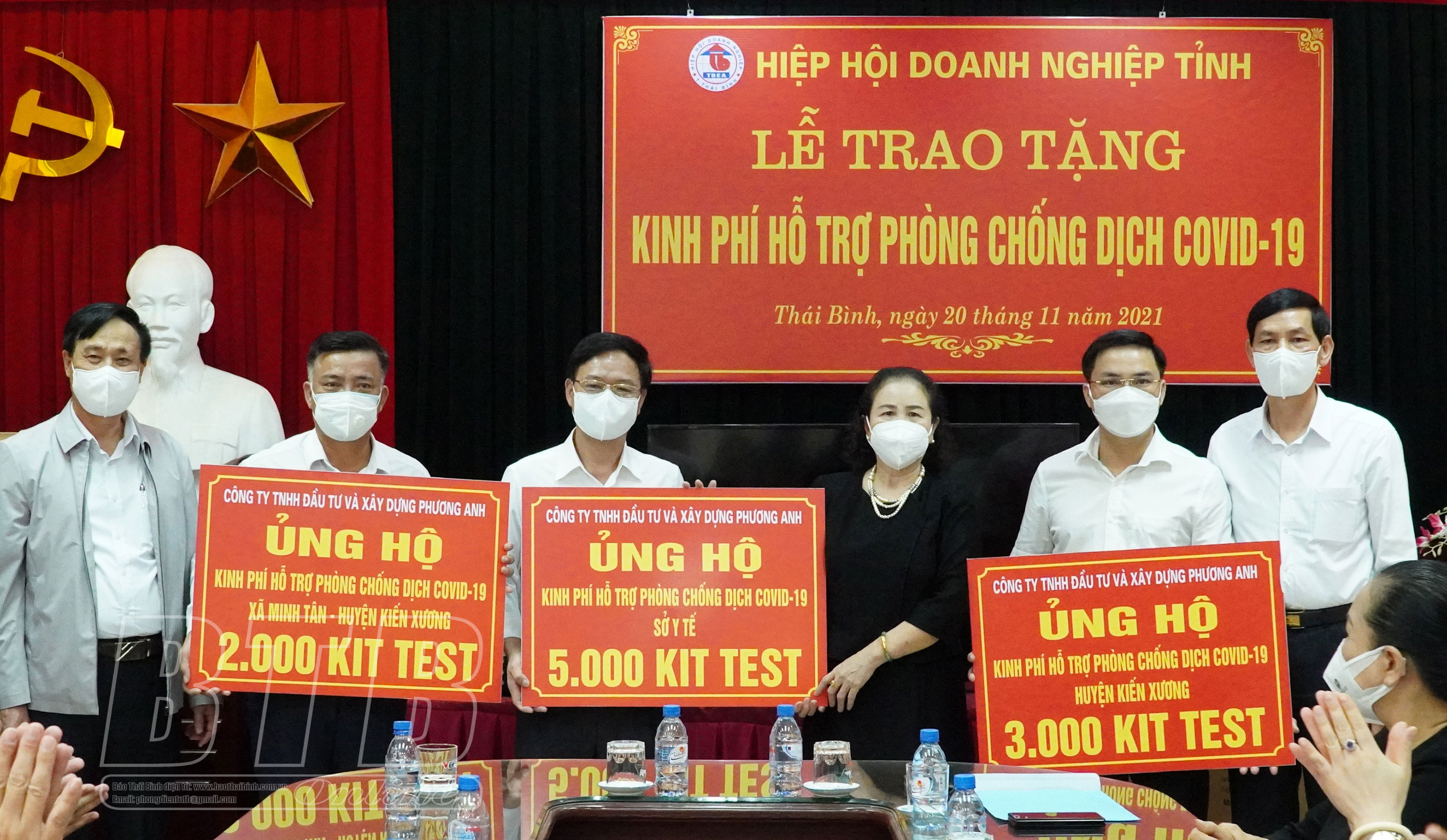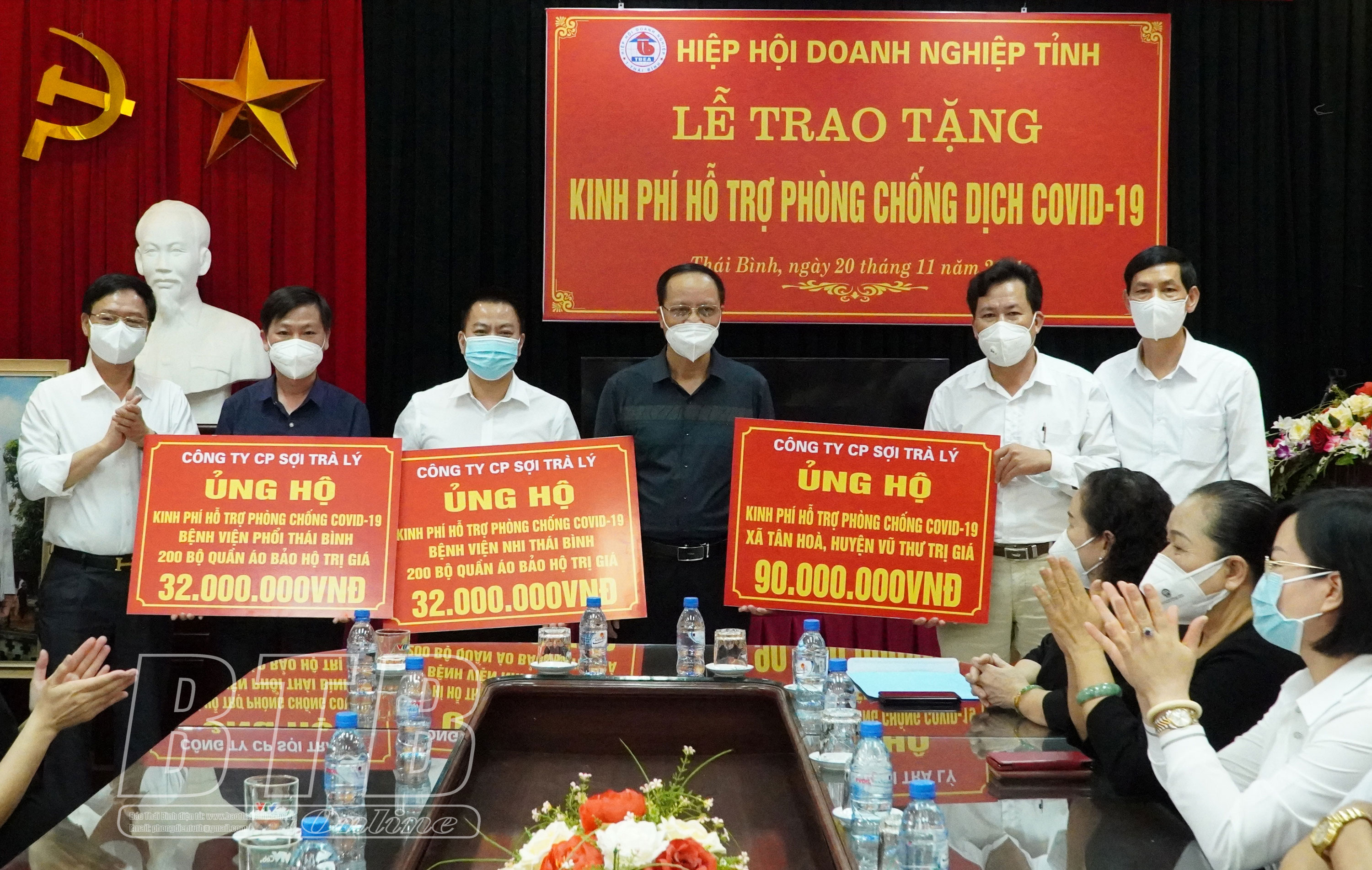 Đại diện Công ty TNHH Vận tải thủy bộ Hải Hà trao gói hỗ trợ tổng trị giá 1 tỷ đồng cho Sở Y tế, Bệnh viện Đa khoa tỉnh, thành phố Thái Bình, huyện Thái Thụy, huyện Đông Hưng; Công ty TNHH Đầu tư và Xây dựng Phương Anh trao gói hỗ trợ 10.000 kit test Covid-19 trị giá khoảng 600 triệu đồng cho Sở Y tế, huyện Kiến Xương và xã Minh Tân (huyện Kiến Xương); Công ty Cổ phần Sợi Trà Lý trao gói hỗ trợ trị giá 154 triệu đồng cho Bệnh viện Nhi Thái Bình, Bệnh viện Phổi Thái Bình và xã Tân Hòa (huyện Vũ Thư).