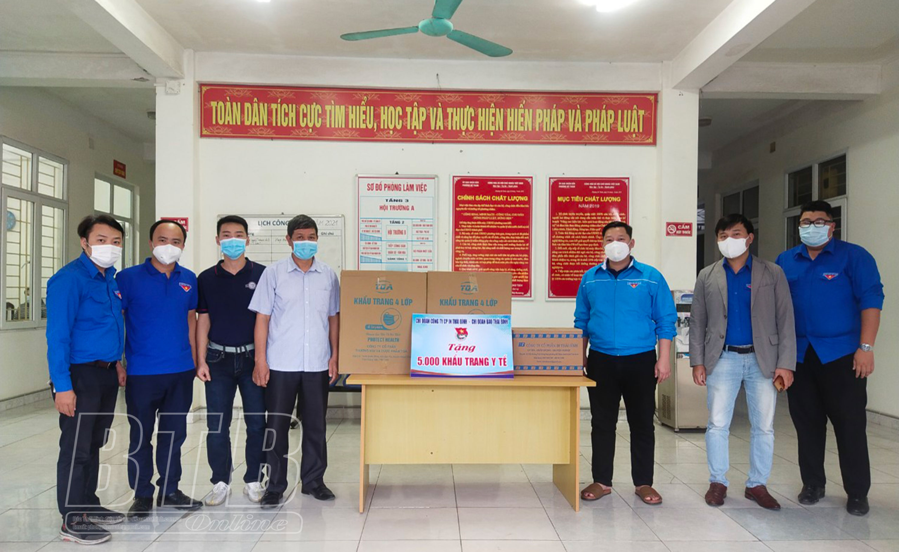 Trước những diễn biến phức tạp của dịch Covid-19 trên địa bàn tỉnh, nhằm chung tay cùng các cấp, các ngành và toàn dân đẩy lùi dịch bệnh, chiều ngày 20/11, Chi đoàn Thanh niên Công ty Cổ phần In Thái Bình phối hợp với Chi đoàn Thanh niên Báo Thái Bình tổ chức trao tặng 12.000 khẩu trang y tế cho hai đơn vị Bệnh viện Điều dưỡng – Phục hồi chức năng Thái Bình và Đoàn Thanh niên phường Đề Thám (thành phố Thái Bình). Đây là hoạt động có ý nghĩa thiết thực, góp phần cùng cán bộ và nhân dân trong tỉnh chiến thắng và đẩy lùi dịch Covid-19.