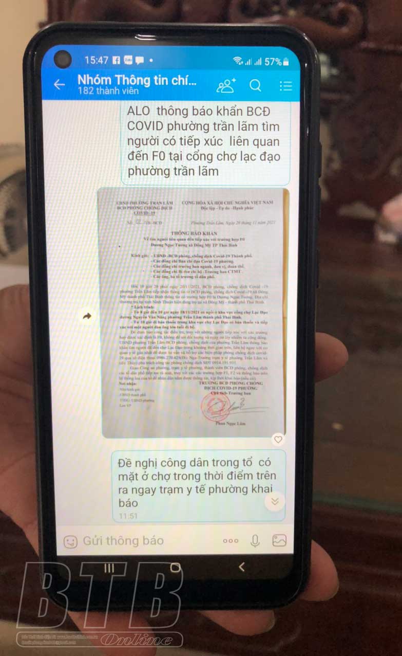 Làm công việc lái taxi, thường xuyên vắng mặt ở nhà nên ông Nguyễn Đình Huyền, tổ 9, phường Trần Lãm (thành phố Thái Bình) không thể cập nhật kịp thời những thông tin về tình hình dịch, những trường hợp nguy cơ trên địa bàn… Thế nhưng, từ ngày là thành viên của “Nhóm thông tin chính quyền tổ 9 phường Trần Lãm” do bà Nguyễn Thị Dung, Tổ trưởng tổ dân phố, Tổ trưởng tổ Covid-19 số 9, phường Trần Lãm thành lập qua ứng dụng zalo, ông Huyền có thể nắm được khu vực nào có F0 và trường hợp nào đang phải cách ly, các biện pháp phòng dịch người dân trong tổ dân phố cần thực hiện, ngày tiêm chủng...
