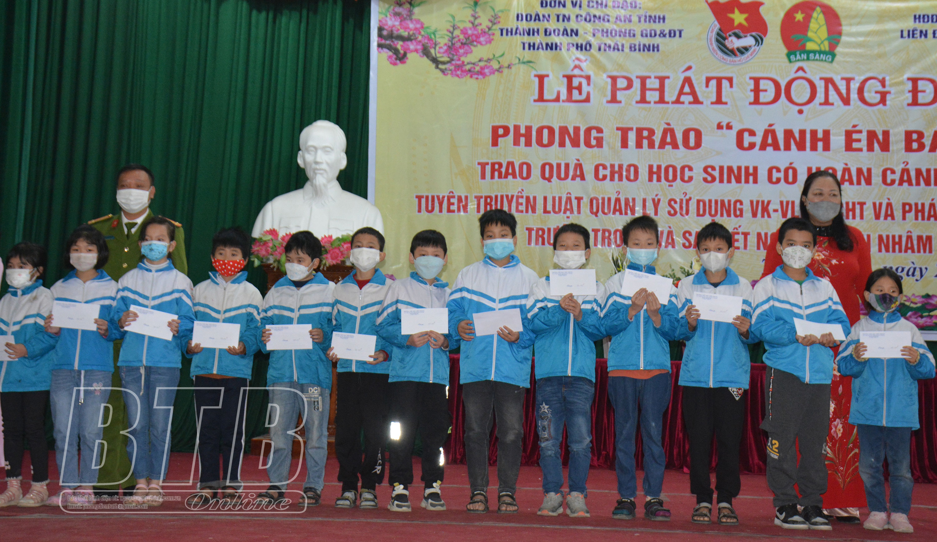 Các em học sinh có hoàn cảnh khó khăn nhận quà của Thành đoàn - Hội đồng Đội thành phố Thái Bình.