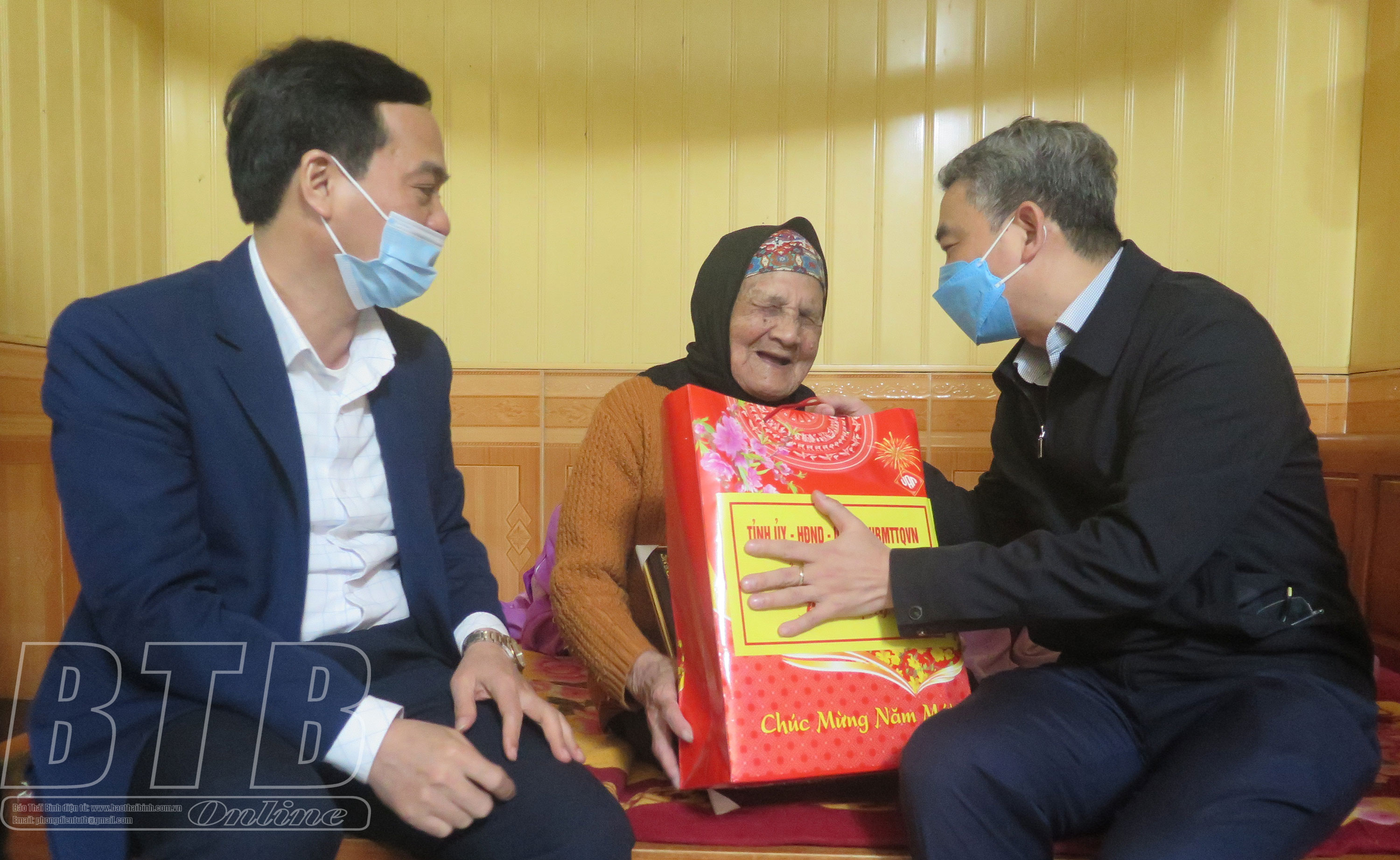 Đồng chí Trưởng ban Tuyên giáo Tỉnh ủy đã đến thăm, tặng quà Bà mẹ Việt Nam anh hùng Vi Thị Luy, thôn Trà Đông; ông Đỗ Văn Nguỳnh, thương binh 1/4, thôn Trà Đoài và bà Bùi Thị Tuyết, 100 tuổi ở thôn Mỹ Nguyên. Đồng chí động viên, thăm hỏi sức khỏe, tình hình đời sống của các gia đình; chúc bà con đón tết đầm ấm, vui vẻ, đồng thời mong muốn các gia đình tiếp tục phát huy truyền thống cách mạng, tuổi cao gương sáng thực hiện tốt các phong trào thi đua ở địa phương và thực hiện tốt các biện pháp phòng, chống dịch Covid-19. Đồng chí cũng đề nghị chính quyền địa phương tiếp tục quan tâm, làm tốt công tác chăm lo cho các gia đình chính sách, người cao tuổi ở địa phương và bảo đảm tình hình an ninh trật tự, công tác phòng, chống dịch Covid-19, nhất là trong dịp tết Nguyên đán.