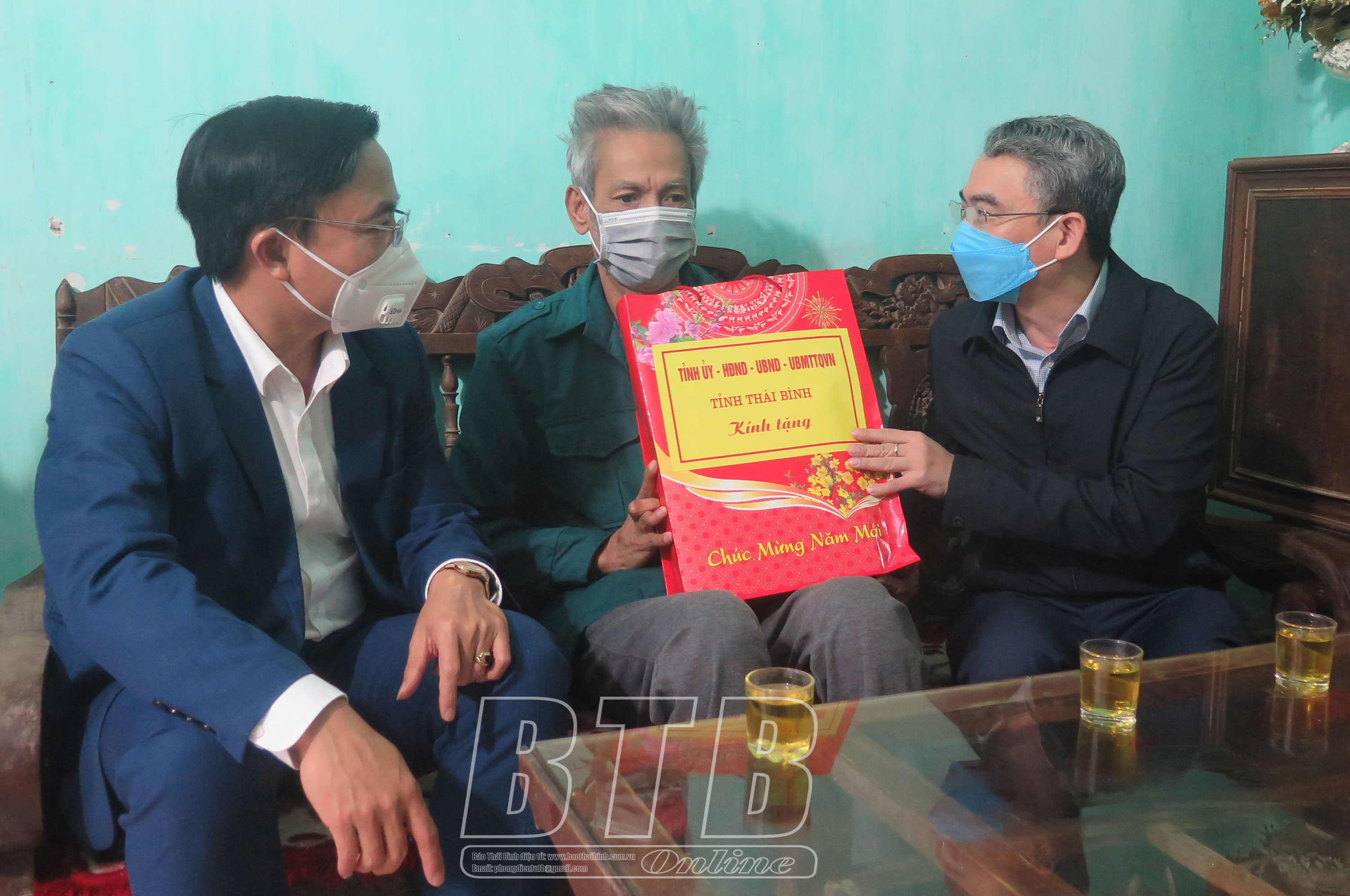 Đồng chí Phạm Đồng Thụy, Ủy viên Ban Thường vụ, Trưởng ban Tuyên giáo Tỉnh ủy và lãnh đạo huyện Kiến Xương tặng quà thương binh Đỗ Văn Nguỳnh, xã Quang Trung.