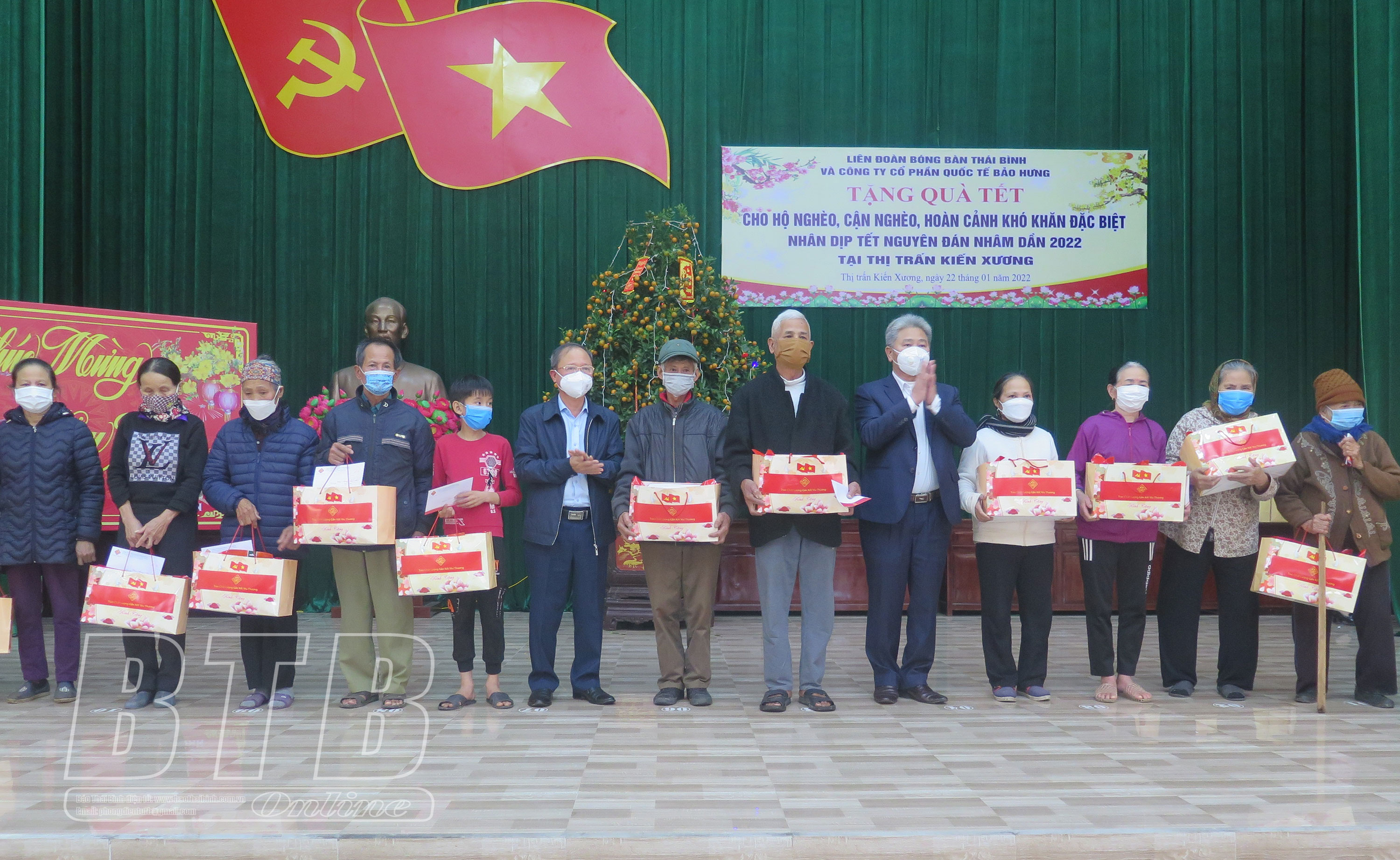 Lãnh đạo Liên đoàn Bóng bàn Thái Bình và lãnh đạo thị trấn Kiến Xương trao quà tết cho hộ nghèo, hộ cận nghèo và gia đình có hoàn cảnh khó khăn.
