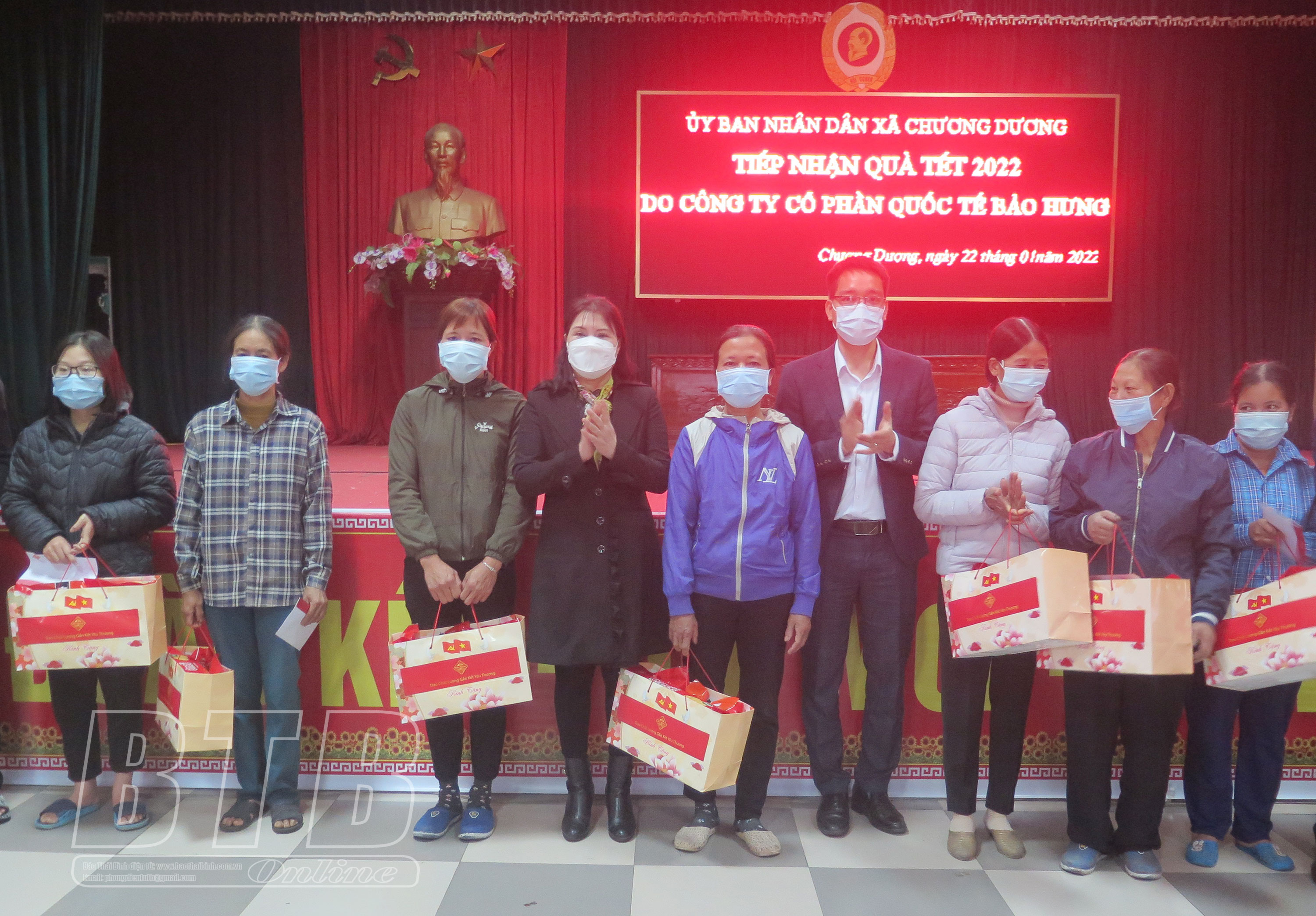 Lãnh đạo Công ty Cổ phần Quốc tế Bảo Hưng và đồng chí Cao Thị Hải, nguyên Tỉnh ủy viên, Phó Chủ tịch UBND tỉnh trao quà cho các hộ nghèo, hộ có hoàn cảnh khó khăn tại xã Chương Dương.