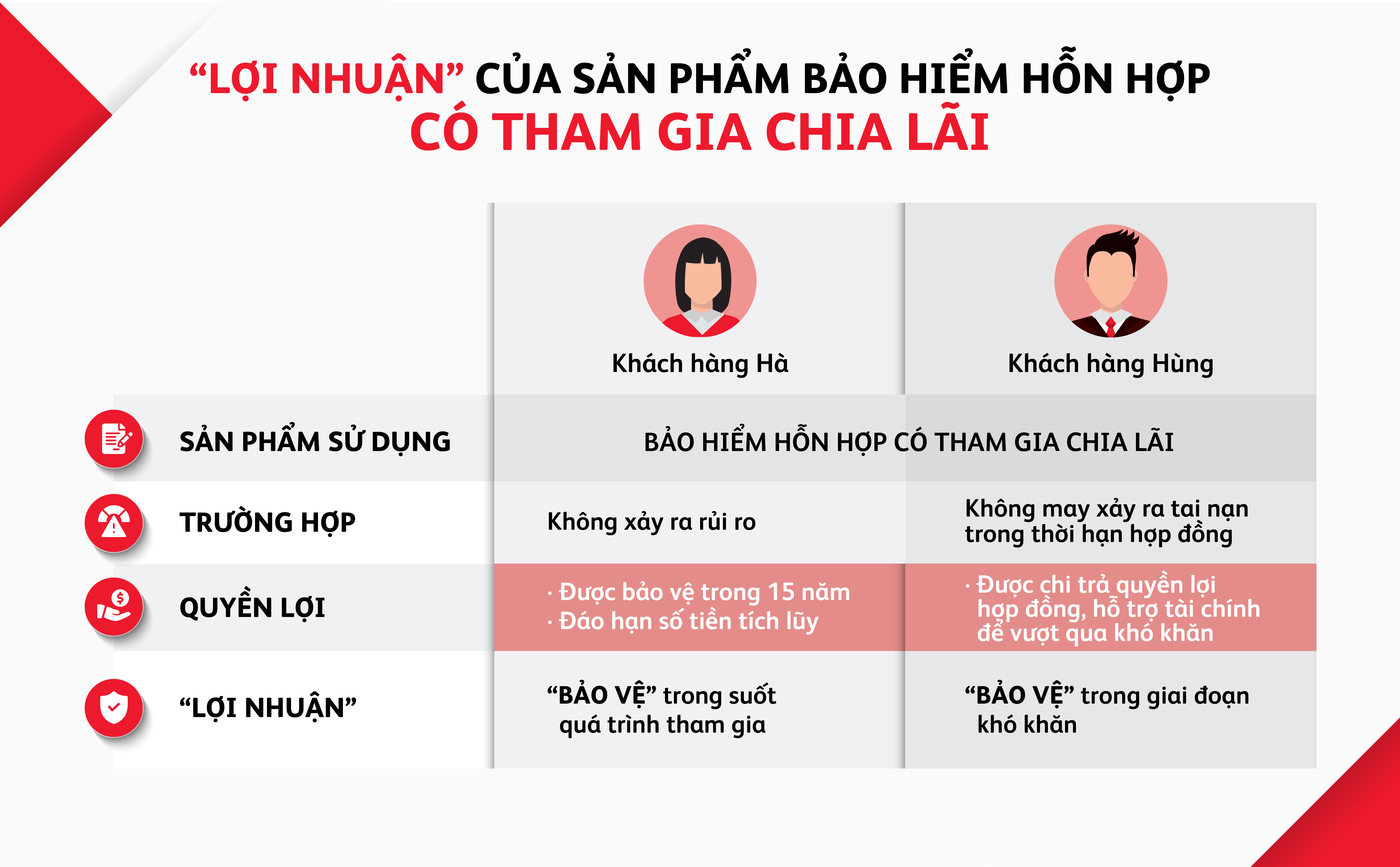 Với sản phẩm bảo hiểm nhân thọ truyền thống, khách hàng sẽ nhận được bảo tức định kỳ và lãi chia cuối hợp đồng phụ thuộc vào tình hình hoạt động của quỹ chủ hợp đồng tham gia. Đây cũng là sản phẩm chị Thanh Hà tham gia, quyền lợi bảo vệ luôn được chú trọng và giá trị gia tăng là khả năng sinh lời. Các quyền lợi của loại hình này gồm quyền lợi đảm bảo và quyền lợi không đảm bảo, bảng minh họa cũng luôn thể hiện rõ ràng về 2 phần quyền lợi này dành cho chủ sở hữu hợp đồng.