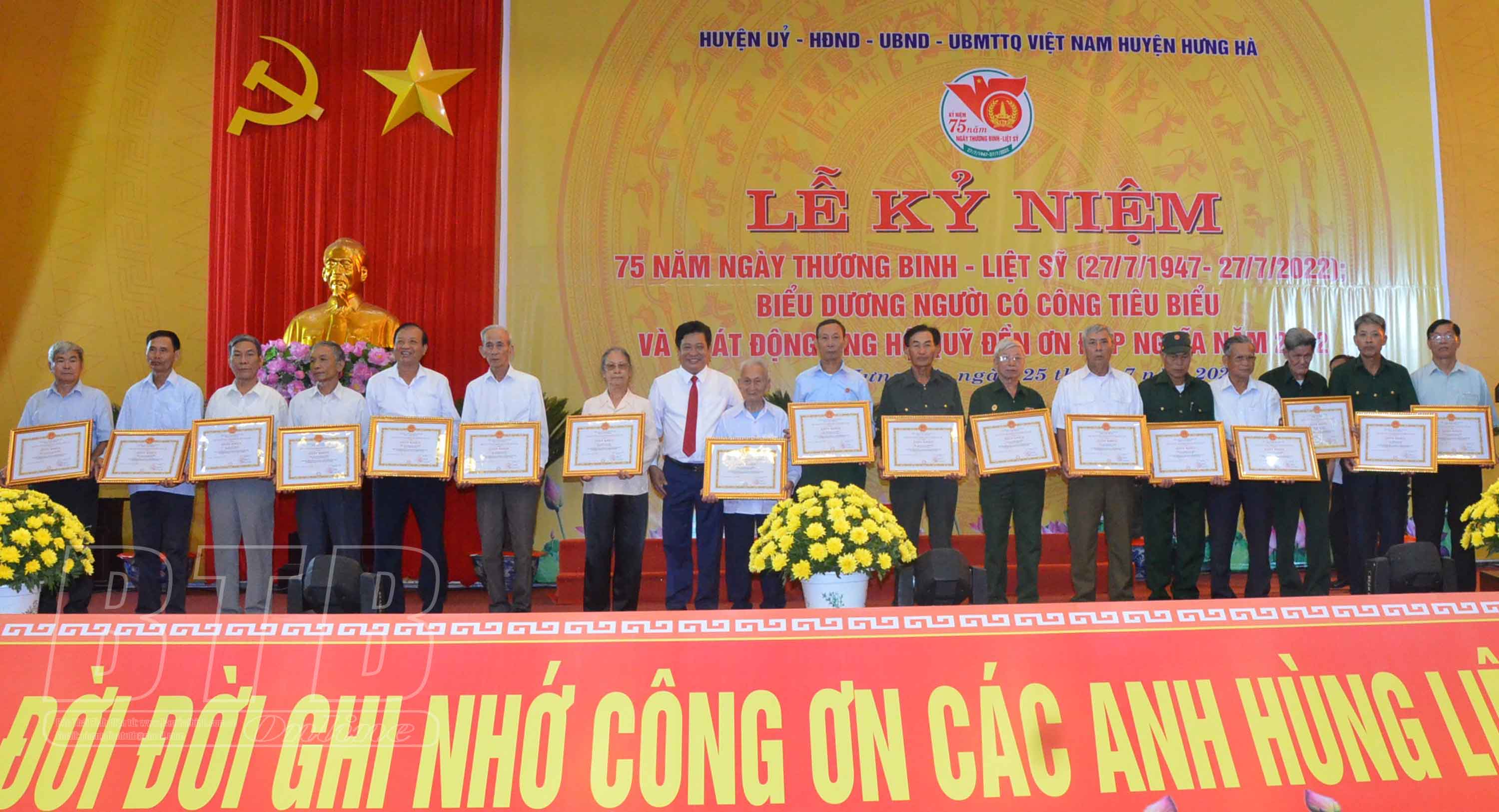 Nhân dịp này, UBND huyện Hưng Hà đã trao tặng giấy khen cho 5 tập thể có thành tích tiêu biểu trong thực hiện phong trào “Đền ơn đáp nghĩa” và 35 cá nhân là người có công và thân nhân người có công có nhiều đóng góp trong các phong trào của địa phương.