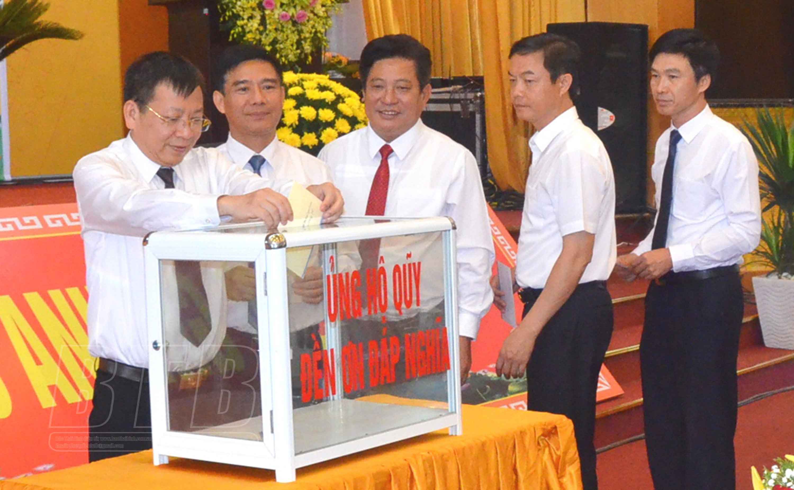 Các đồng chí lãnh đạo huyện Hưng Hà ủng hộ quỹ Đền ơn đáp nghĩa.