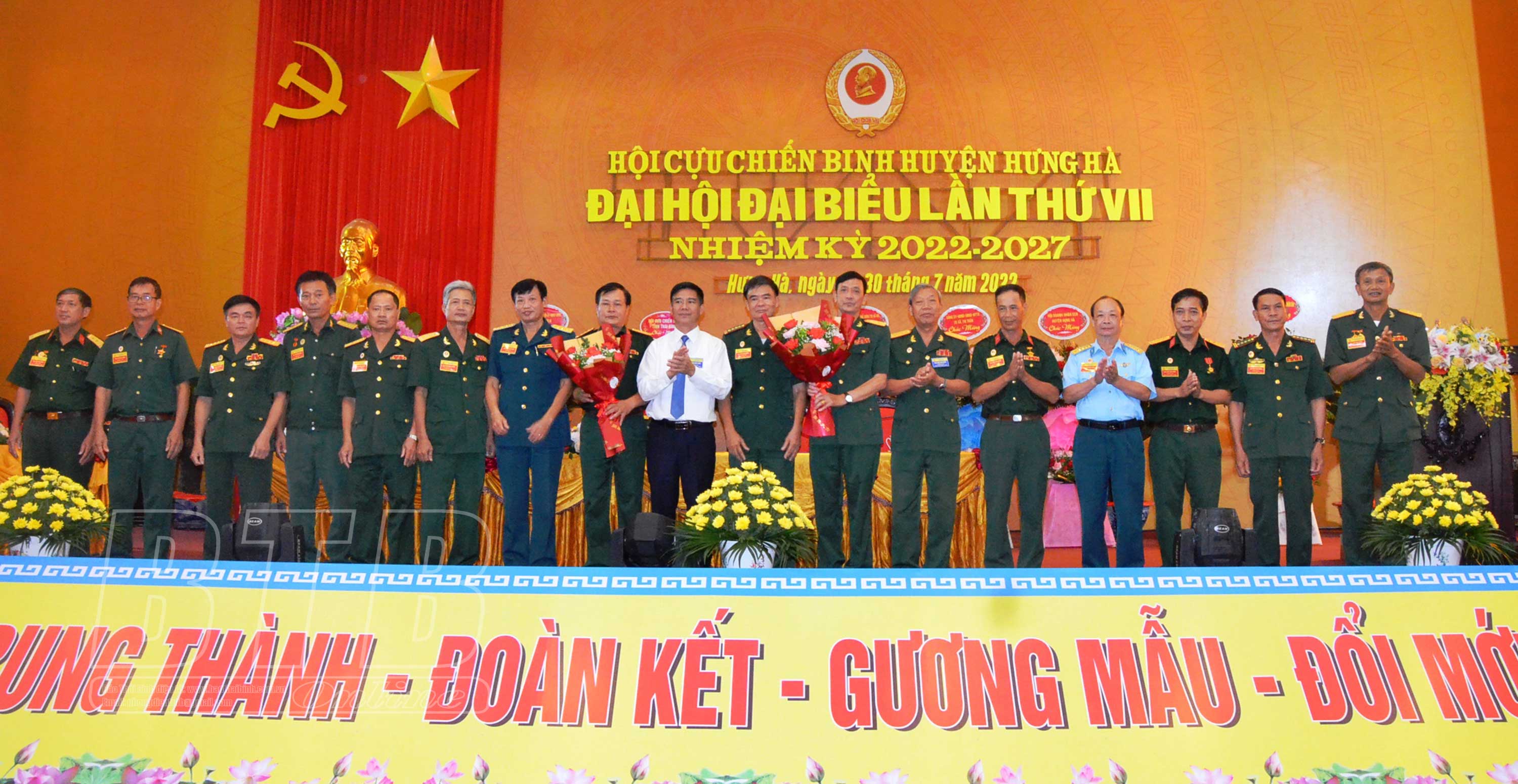 Lãnh đạo Hội CCB tỉnh, huyện Hưng Hà tặng hoa chúc mừng Ban Chấp hành khoá mới.