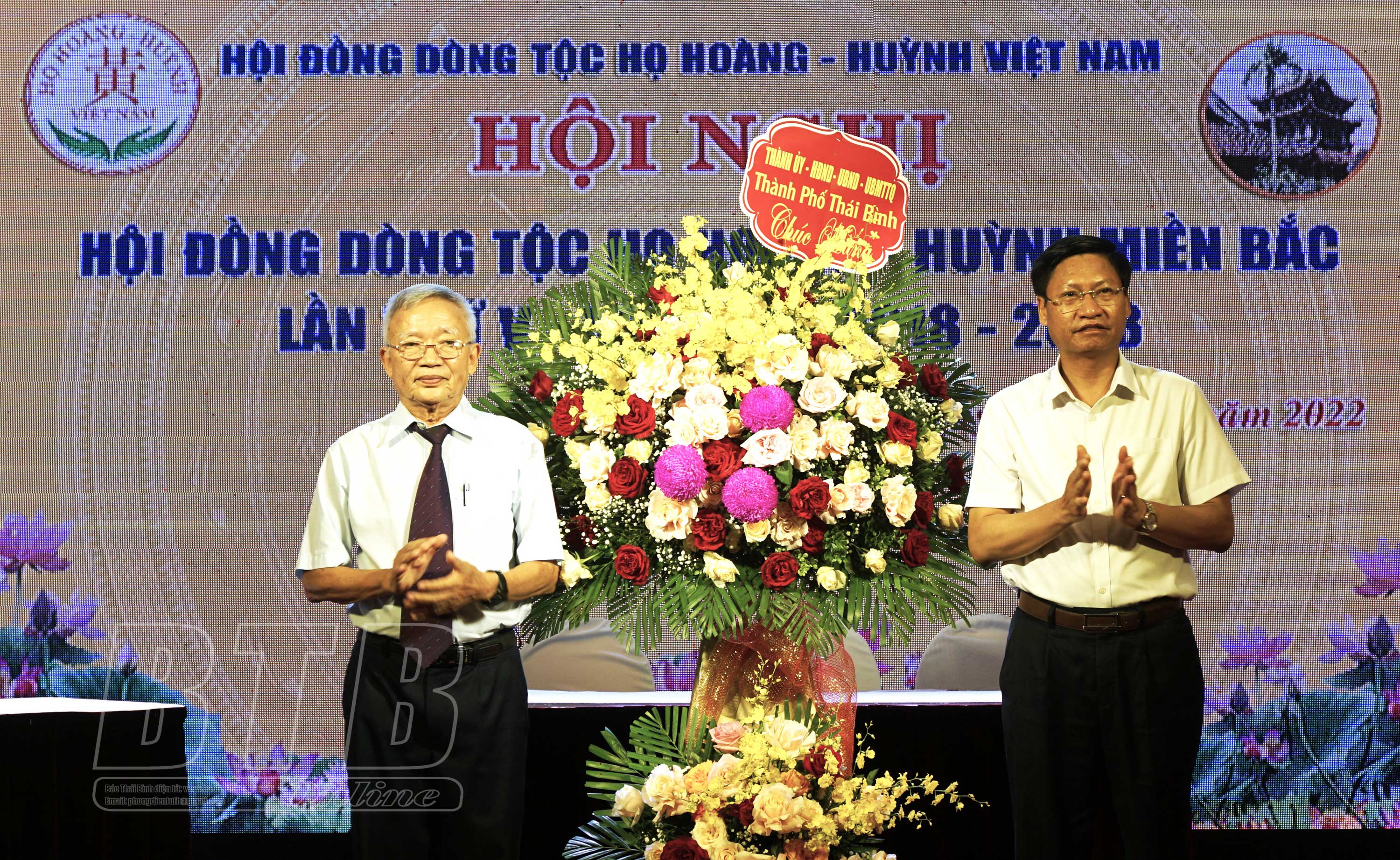 Đồng chí Đinh Gia Dũng, Phó Bí thư Thành ủy, Chủ tịch UBND thành phố Thái Bình tặng hoa chúc mừng hội nghị.