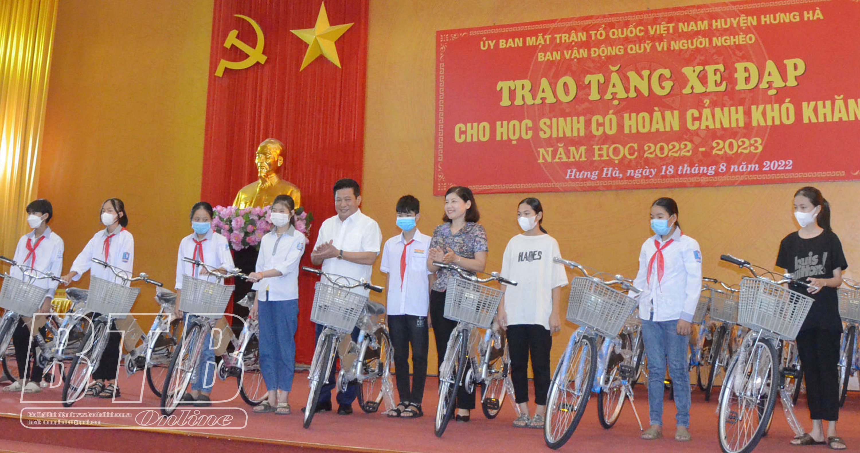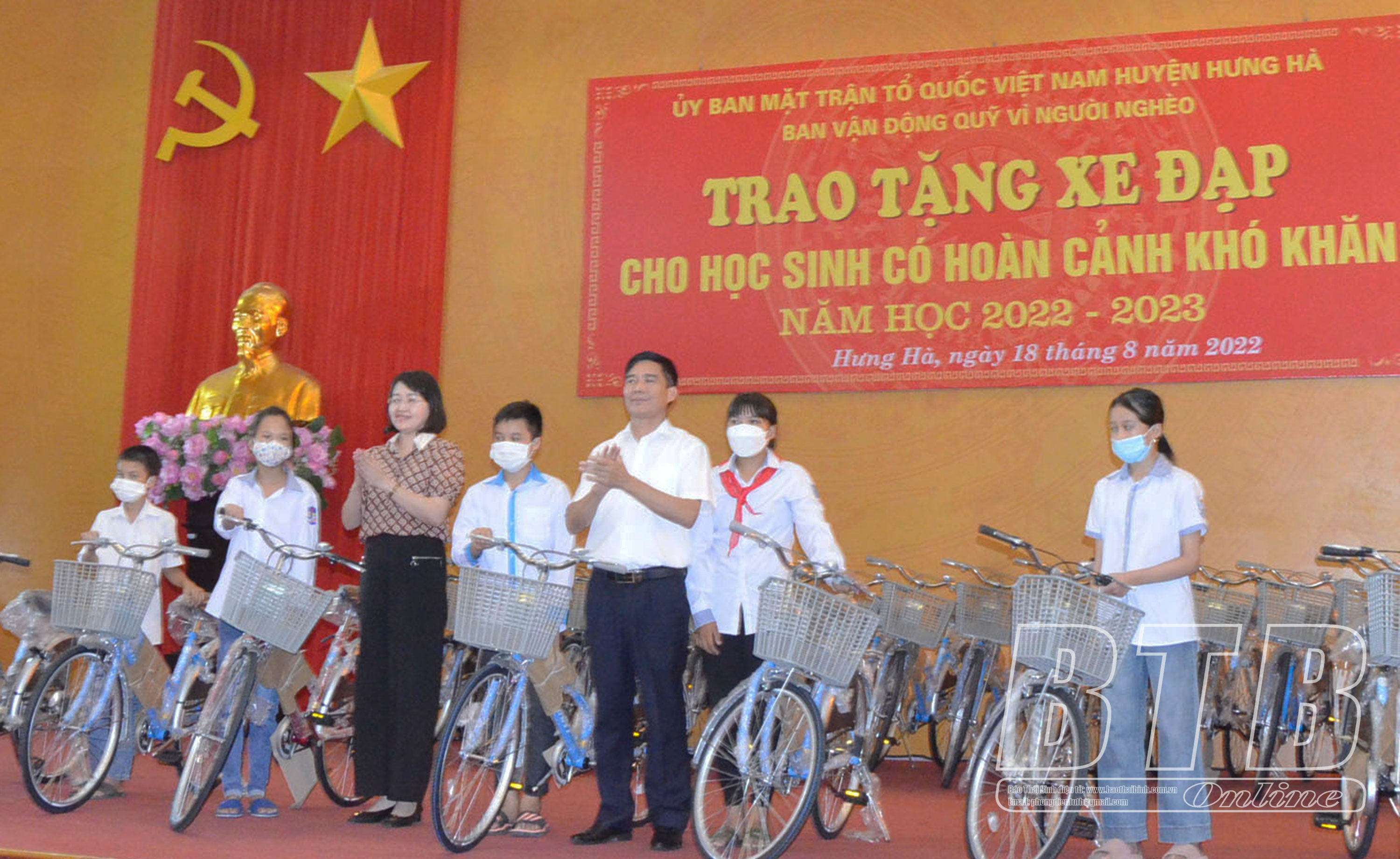 Nhân dịp đầu năm học mới 2022 - 2023, chiều ngày 18/8, Ủy ban MTTQ huyện Hưng Hà phối hợp với Phòng Giáo dục và Đào tạo huyện tổ chức trao 41 xe đạp cho học sinh các trường THCS và THPT là con của các hộ nghèo, hộ cận nghèo, hộ có hoàn cảnh đặc biệt khó khăn trên địa bàn huyện với tổng kinh phí trên 80 triệu đồng được trích từ nguồn quỹ “Vì người nghèo” của huyện.