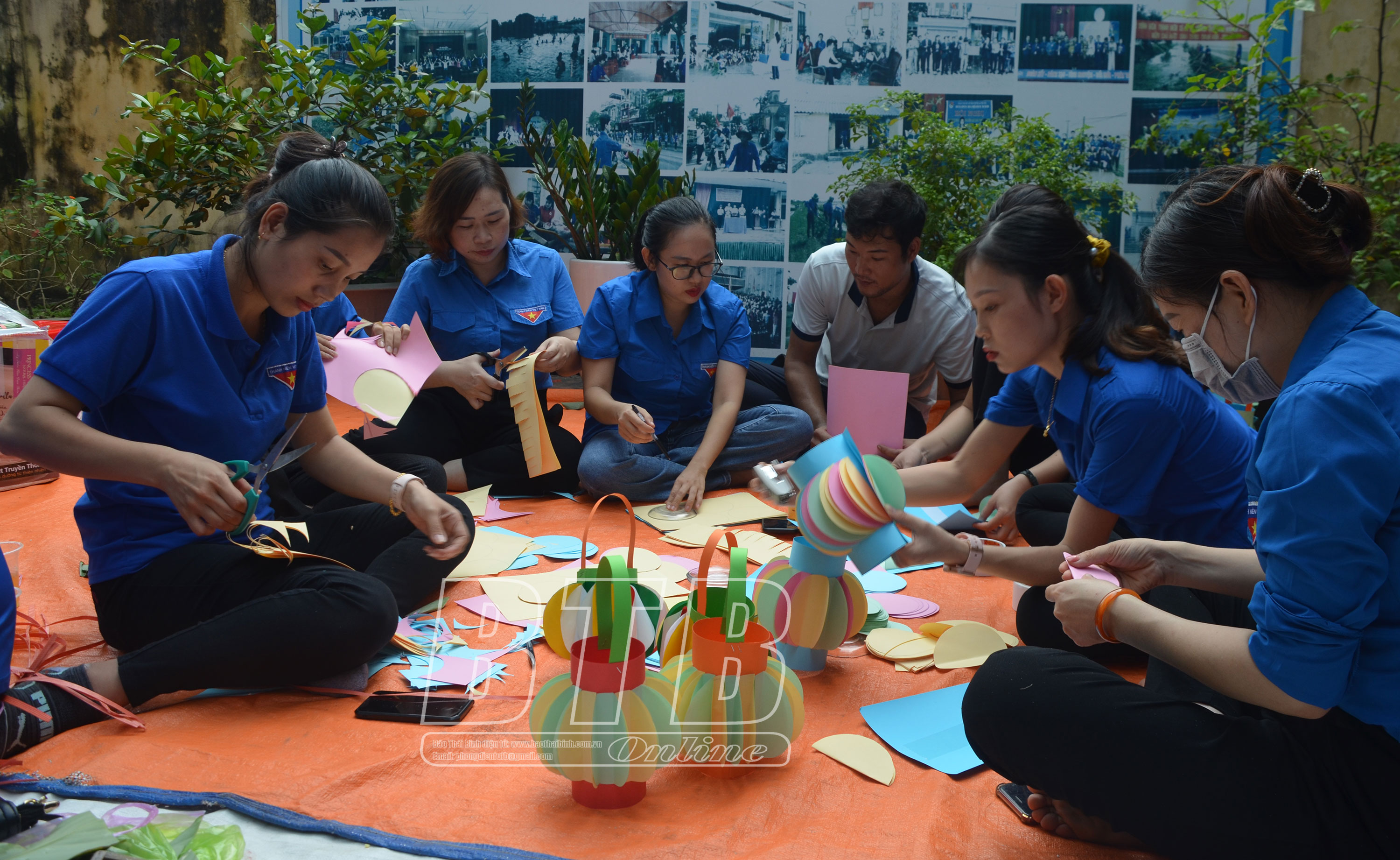 Cán bộ đoàn tự tay làm đèn lồng để tặng các em thiếu niên, nhi đồng có hoàn cảnh khó khăn.