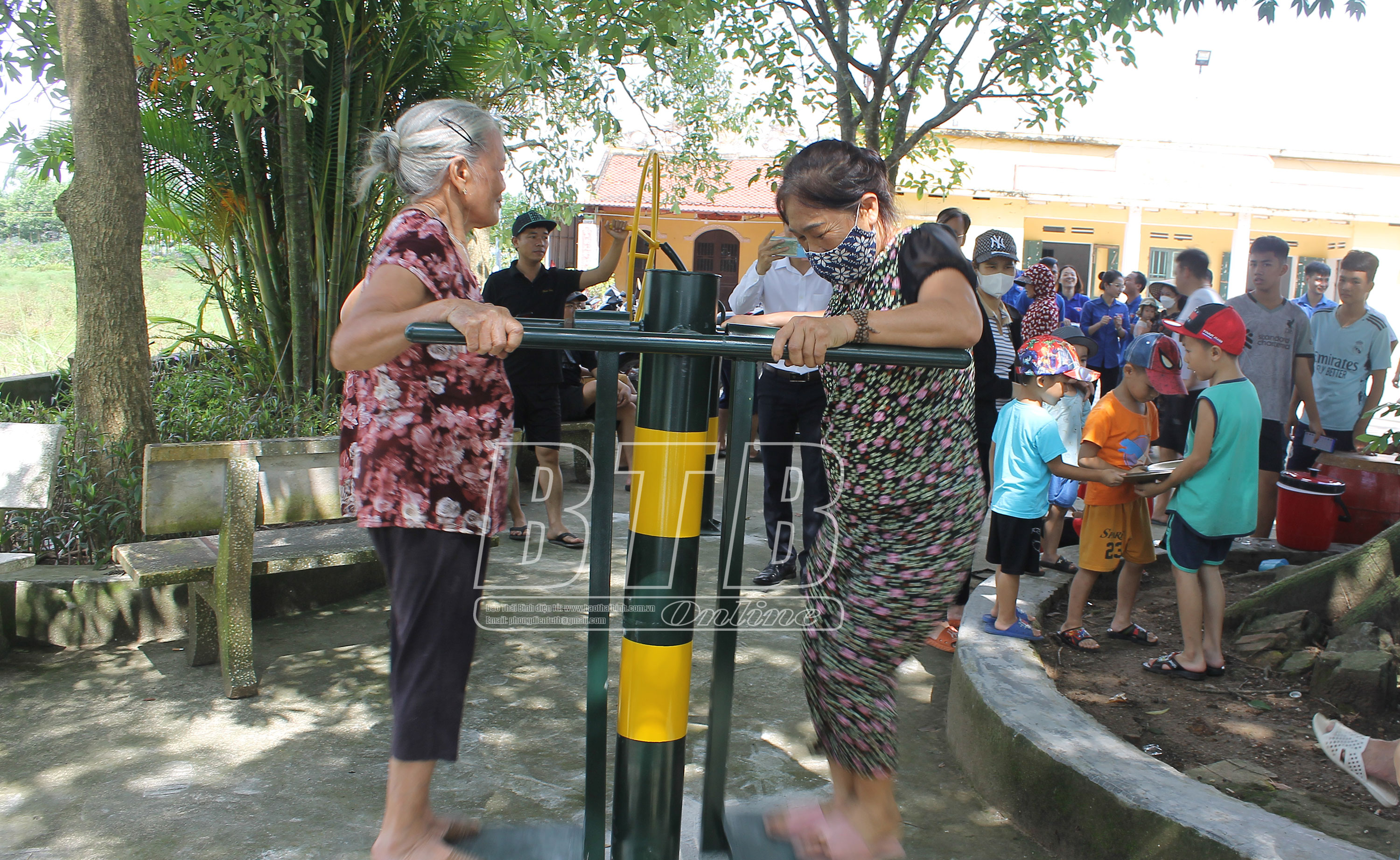 Nhân dân thôn Phú Thứ luyện tập thể dục, thể thao với dụng cụ tập huyện ngoài trời.
