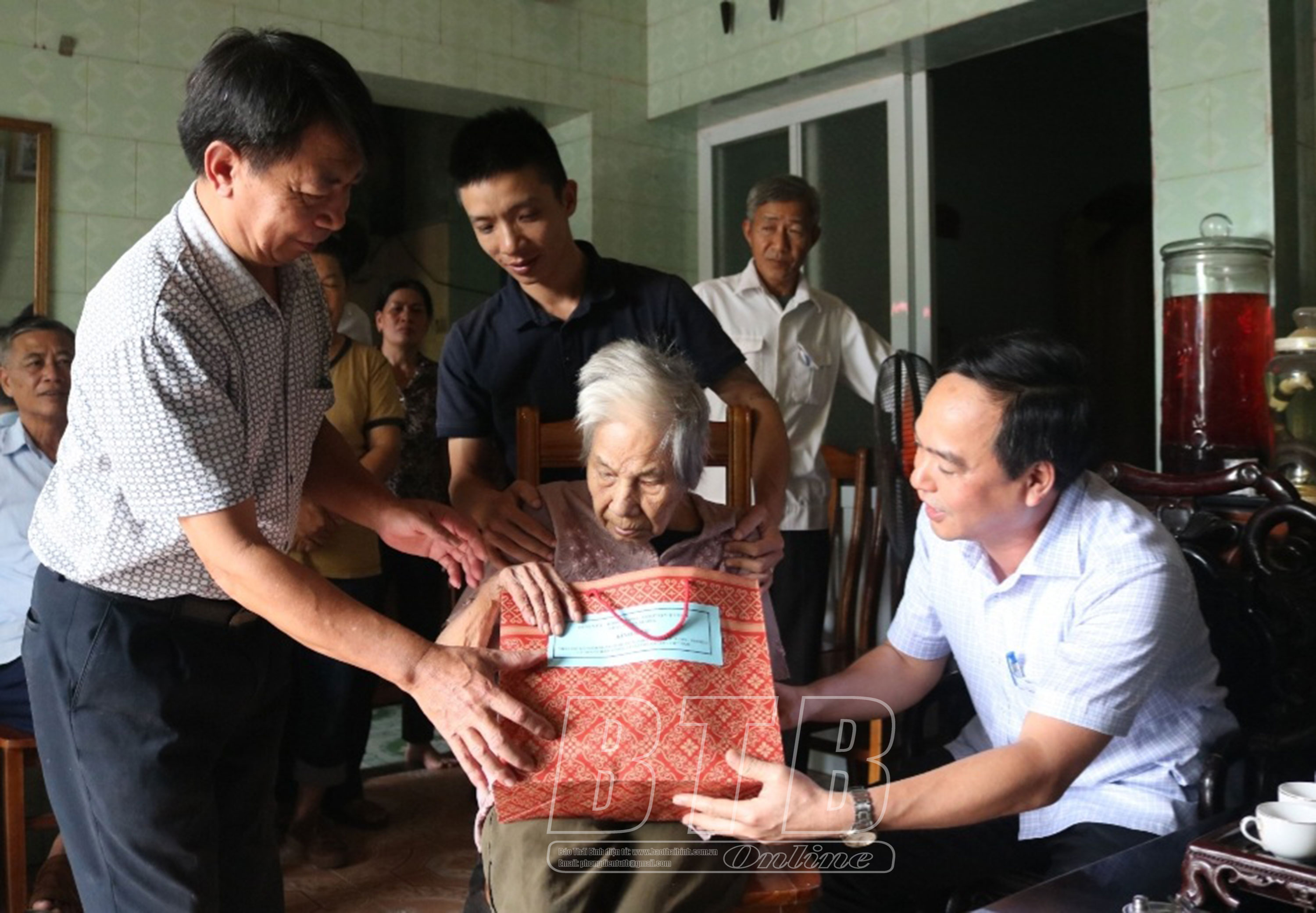 Lãnh đạo Ban đại diện Hội Người cao tuổi tỉnh và huyện Kiến Xương trao quà cho cụ Phạm Thị Ngoãn, xã Vũ Lễ.