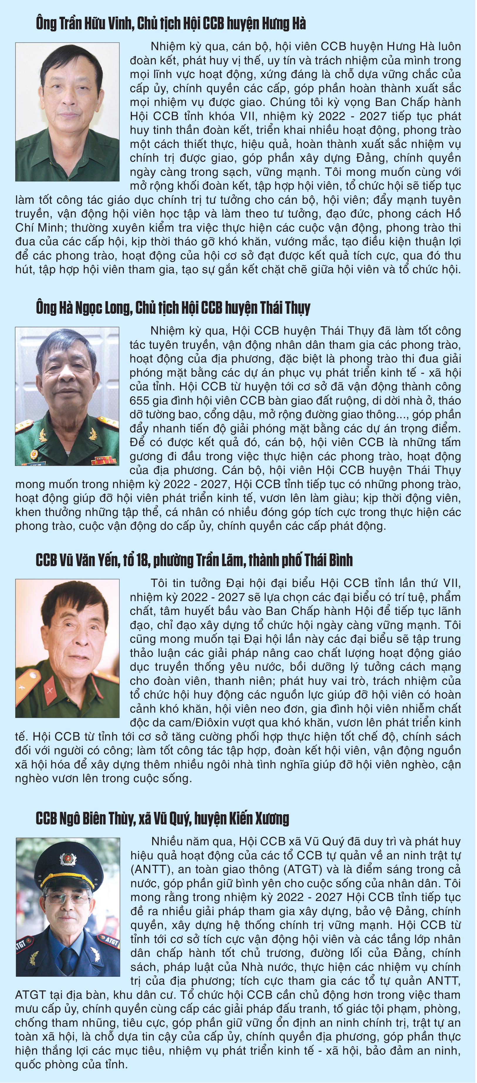 Trong nhiệm kỳ qua, các CCB đã phát huy vai trò gương mẫu, tích cực học tập và làm theo tư tưởng, đạo đức, phong cách Hồ Chí Minh, tham gia xây dựng nông thôn mới, các cuộc vận động, phong trào thi đua. Tổ chức hội đã hoàn thành sơ kết 5 năm thực hiện Chỉ thị số 05-CT/TW của Bộ Chính trị, triển khai thực hiện Kết luận số 01-KL/TW của Bộ Chính trị về tiếp tục thực hiện Chỉ thị số 05-CT/TW. Đã dự thảo 20 biểu hiện cụ thể của đạo đức CCB: Trung thành - Đoàn kết - Gương mẫu - Kỷ cương - Trách nhiệm theo tư tưởng, đạo đức, phong cách Hồ Chí Minh triển khai tới cơ sở để CCB “tự soi, tự sửa”, phấn đấu rèn luyện.