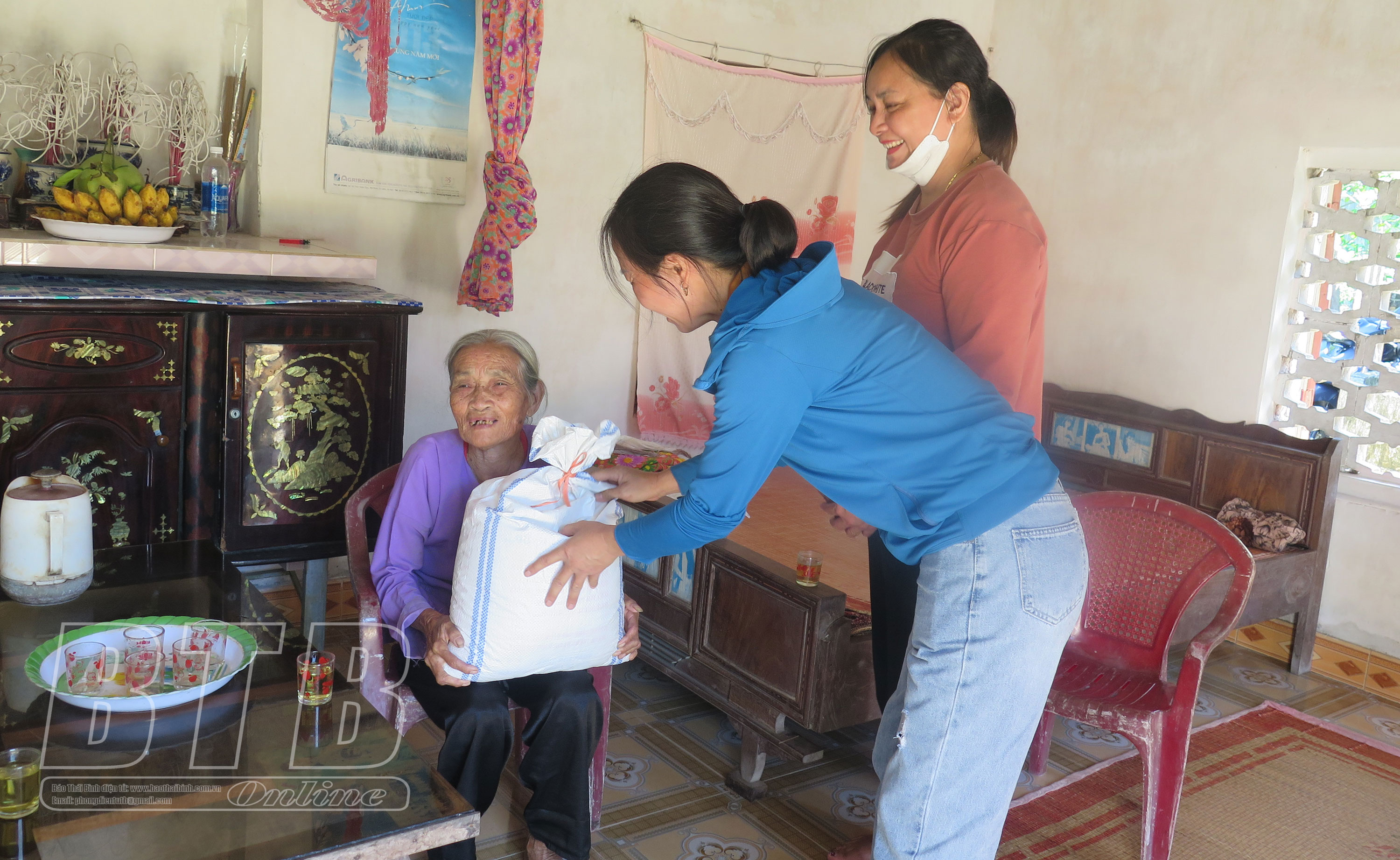 Chi hội Phụ nữ thôn 3, xã Vũ Hòa trao gạo cho bà Đào Thị Kịt.