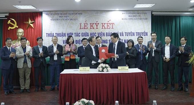 PGS. TS. Lưu Văn An, nguyên Quyền Giám đốc Học viện Báo chí và Tuyên truyền và Tiến sĩ, Nhà báo Trần Doãn Tiến, Tổng Biên tập Báo điện tử Đảng Cộng sản Việt Nam tại Lễ ký kết thỏa thuận hợp tác giữa Học viện Báo chí và Tuyên truyền và Báo điện tử Đảng Cộng sản Việt Nam (ngày 11/12/2020) - Ảnh tư liệu.