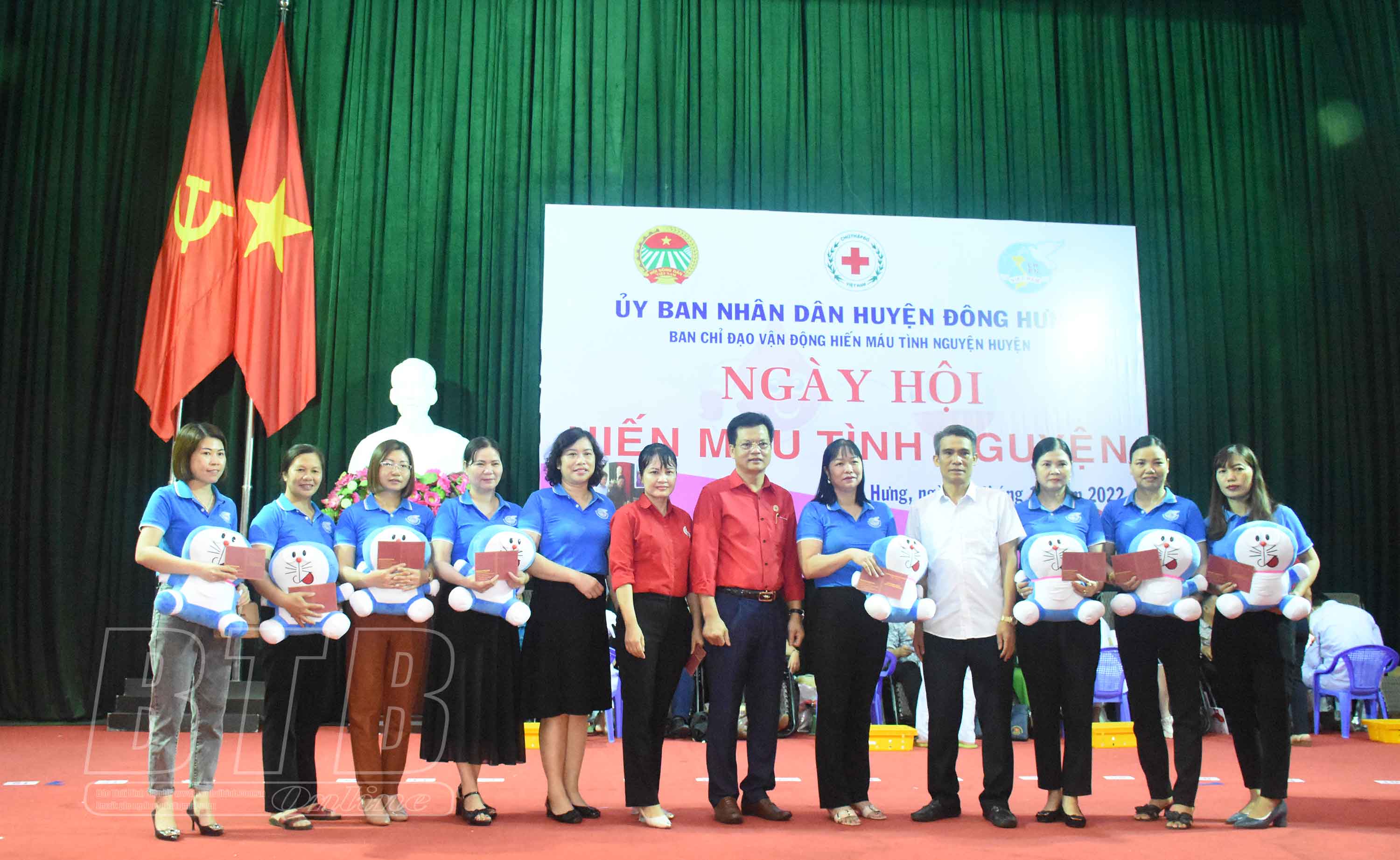 Lãnh đạo Hội Chữ thập đỏ huyện Đông Hưng trao giấy chứng nhận hiến máu và quà lưu niệm cho người tham gia hiến máu.