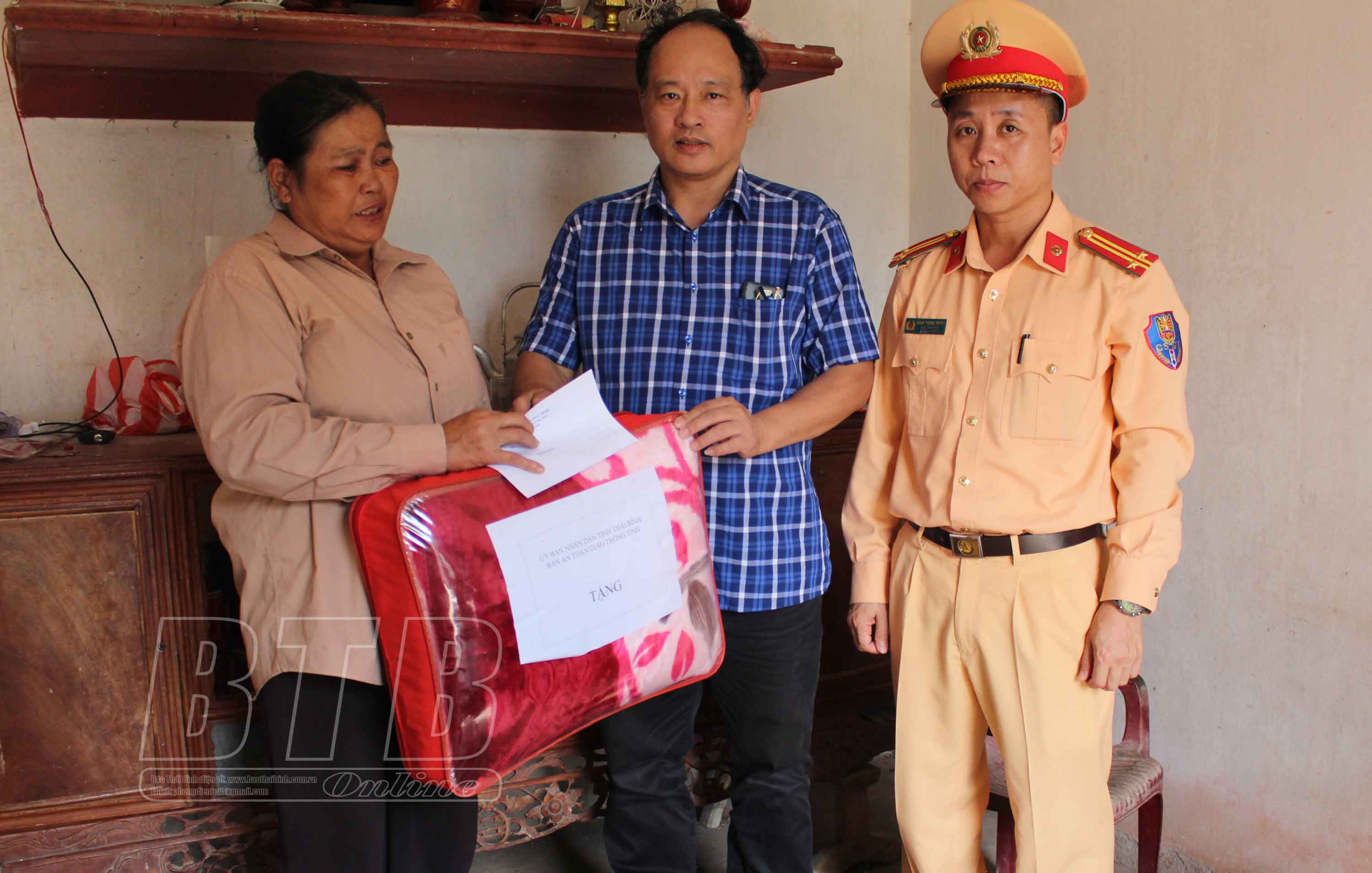 Đại diện Ban ATGT tỉnh tặng quà gia đình nạn nhân ở xã Hòa Bình (Kiến Xương).