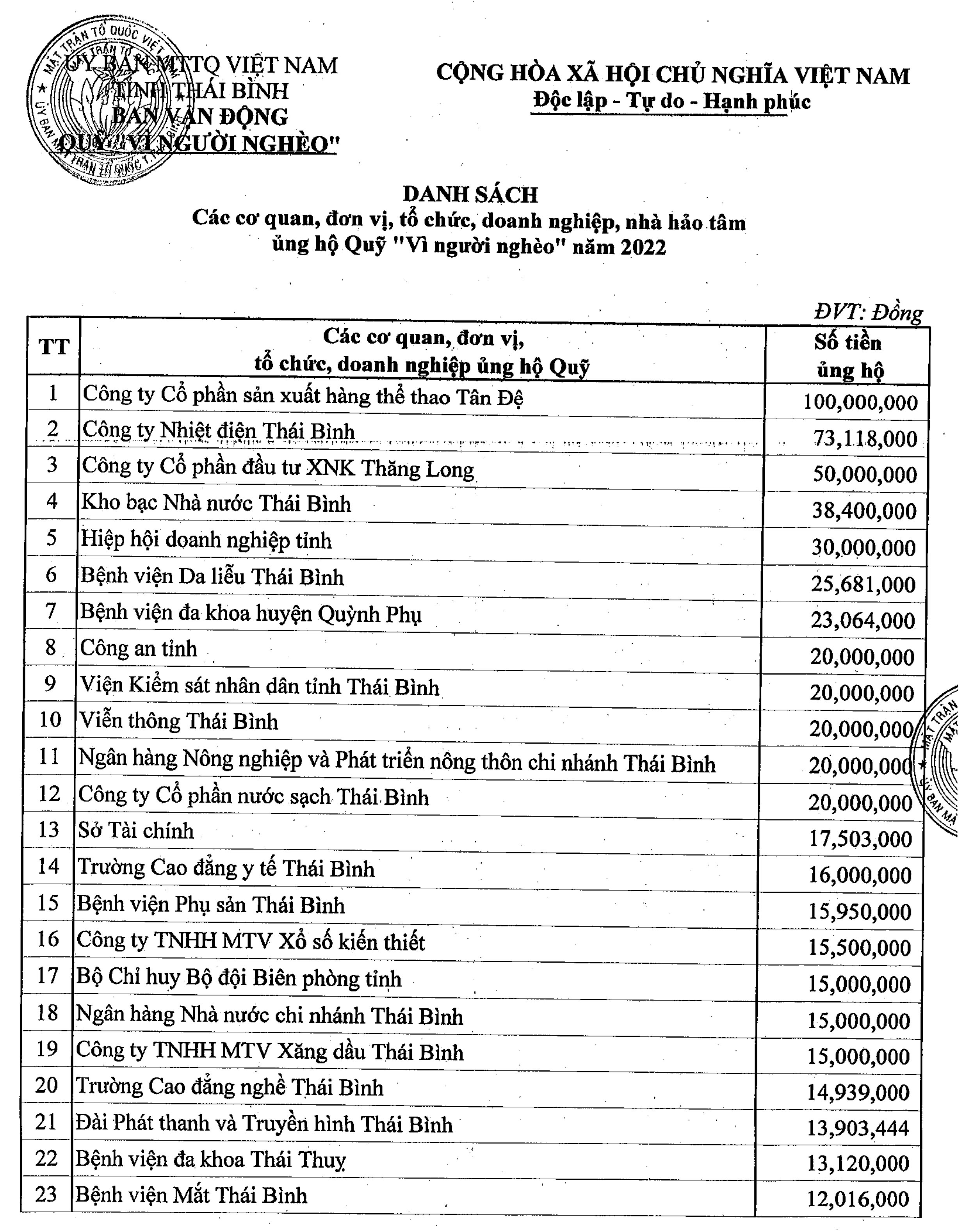Danh sách các cơ quan, đơn vị, tổ chức, doanh nghiệp, nhà hảo tâm ủng hộ quỹ "Vì người nghèo" năm 2022