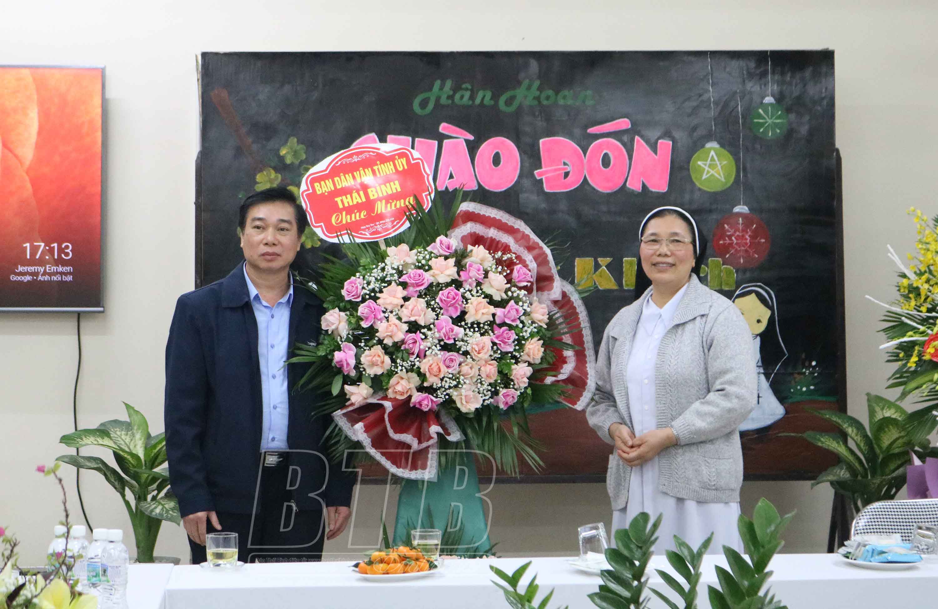Đồng chí Nguyễn Văn Giang, Ủy viên Ban Thường vụ, Trưởng ban Dân vận Tỉnh ủy tặng hoa chúc mừng Dòng Nữ tu Đa Minh Thái Bình nhân dịp lễ Giáng sinh năm 2022.