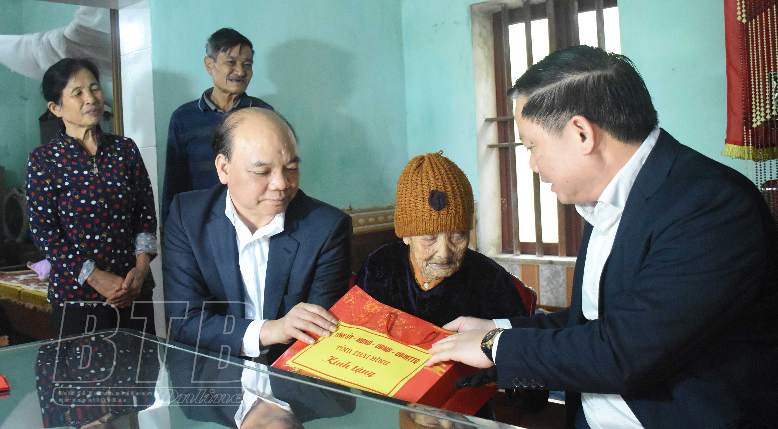 Các đồng chí lãnh tỉnh tặng quà cụ Nguyễn Thị Tẹo, người tròn 100 tuổi.