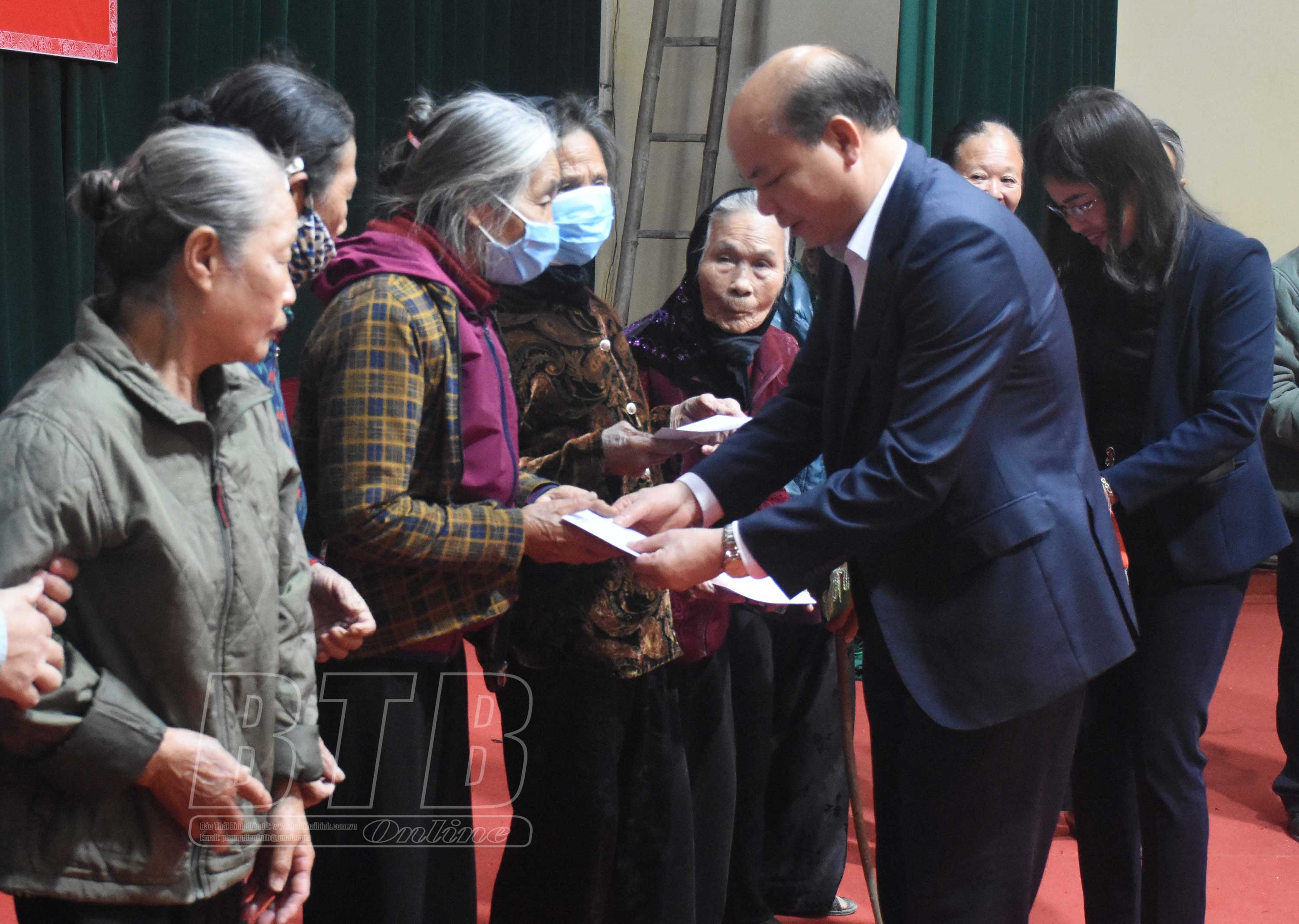Đồng chí Nguyễn Khắc Thận, Phó Bí thư Tỉnh ủy, Chủ tịch UBND tỉnh tặng quà các hộ nghèo xã Tân Lập (Vũ Thư).