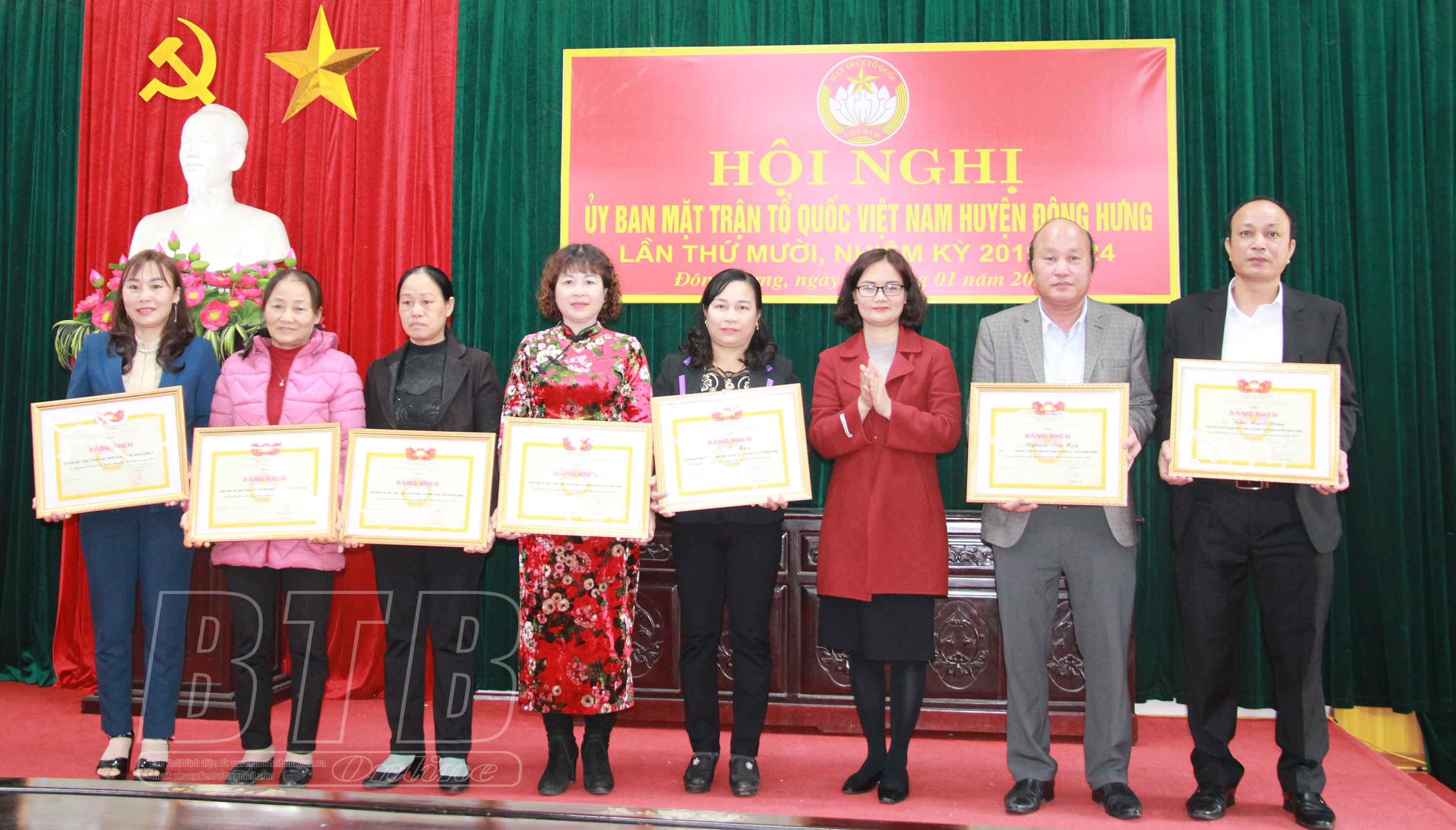 Năm 2022, MTTQ các cấp trên địa bàn huyện Đông Hưng đã triển khai thực hiện đồng bộ, hiệu quả các nhiệm vụ công tác, các phong trào thi đua yêu nước, cuộc vận động “Toàn dân đoàn kết xây dựng nông thôn mới, đô thị văn minh”, xây dựng quỹ “Vì người nghèo”... Trong năm, 100% khu dân cư tổ chức ngày hội đại đoàn kết toàn dân. Tại ngày hội, MTTQ các cấp đã trao quà cho các hộ nghèo, hộ có hoàn cảnh khó khăn, biểu dương gần 9.000 cá nhân, gia đình văn hóa tiêu biểu. Qua bình xét, năm 2022 toàn huyện có gần 75.000 gia đình, 220 thôn, tổ dân phố đạt và giữ vững danh hiệu “văn hóa”, 27/37 xã đạt và giữ vững danh hiệu “xã đạt chuẩn văn hóa nông thôn mới”, thị trấn Đông Hưng đạt chuẩn văn minh đô thị. MTTQ các cấp cũng đã huy động các nguồn lực hỗ trợ xây dựng mới, sửa chữa 18 nhà đại đoàn kết. Bên cạnh đó, MTTQ các cấp trên địa bàn huyện đã phát huy dân chủ, giám sát và phản biện xã hội, tham gia xây dựng Đảng, chính quyền vững mạnh.