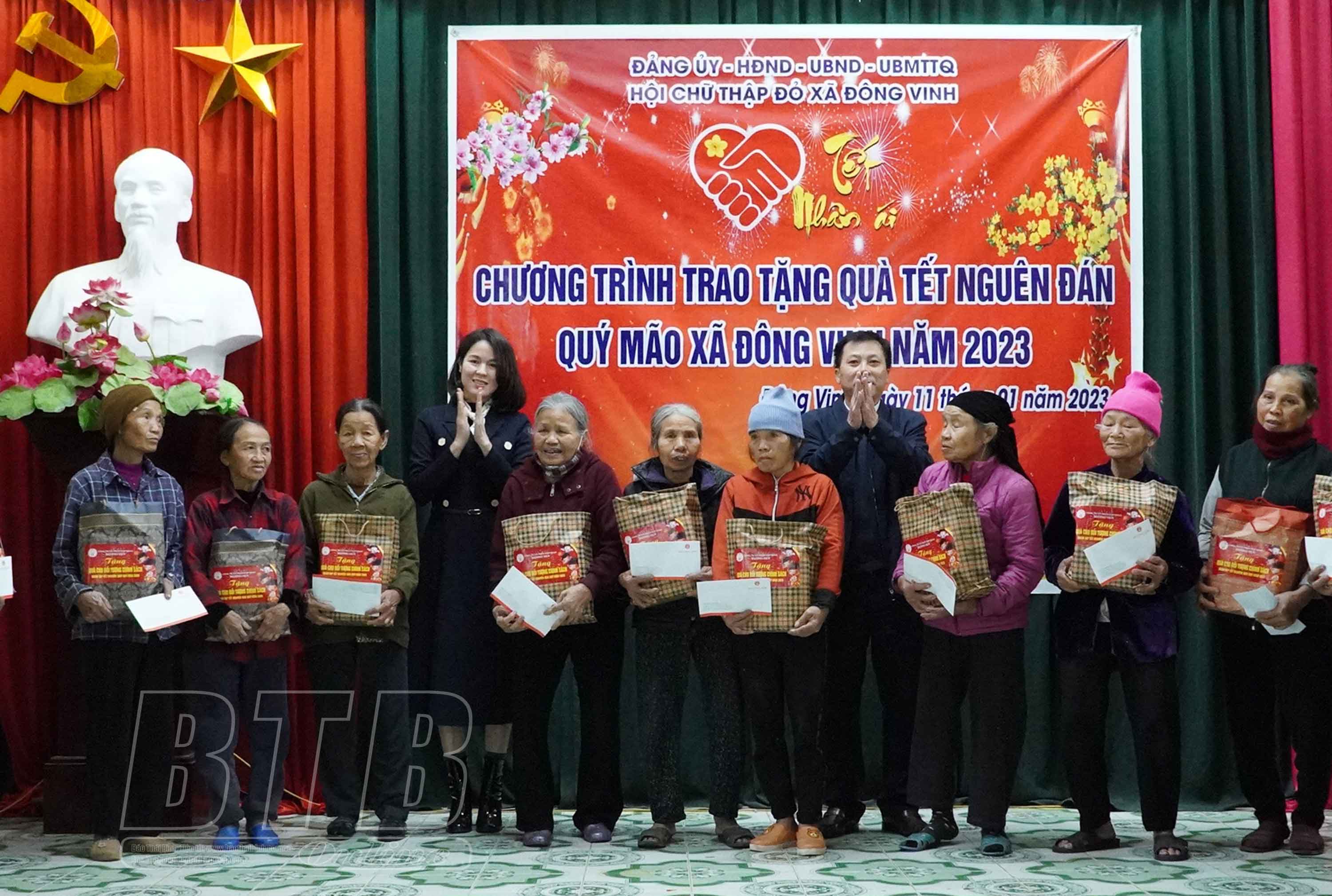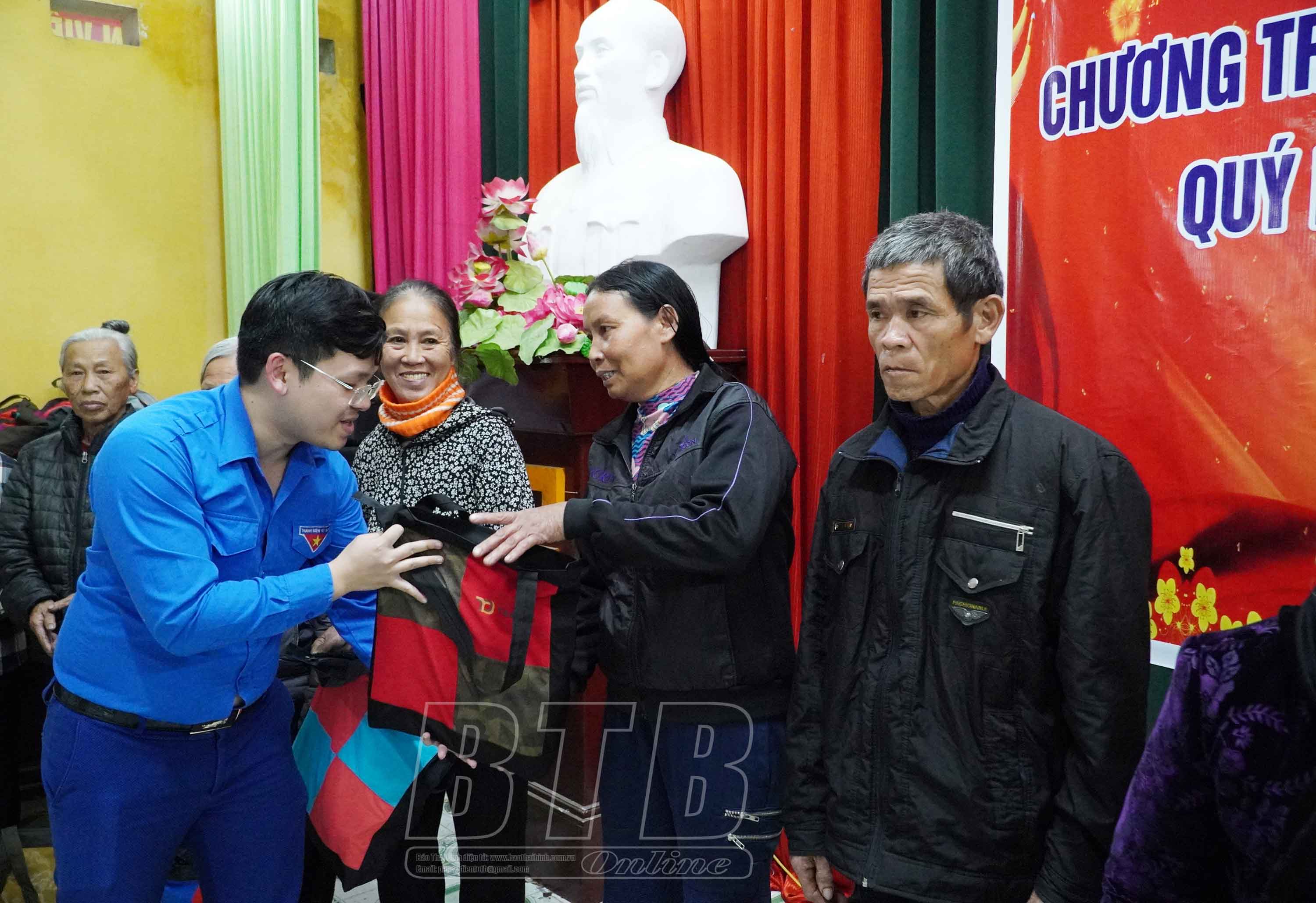 Đoàn đã trao 230 suất quà với tổng trị giá 110 triệu đồng tới các hộ nghèo của địa phương. Đây là tấm lòng của lãnh đạo Viện Kiểm sát nhân dân tỉnh, Hiệp hội Doanh nghiệp tỉnh và các doanh nghiệp: Công ty Cổ phần Sản xuất hàng thể thao Tân Đệ, Công ty Cổ phần Tập đoàn Hương Sen, Ngân hàng Thương mại Cổ phần Sài Gòn - Hà Nội (SHB) chi nhánh Thái Bình gửi tới các hộ nghèo với mong muốn chia sẻ khó khăn, hỗ trợ các gia đình có một cái tết đầm ấm, hạnh phúc và thêm động lực vươn lên trong cuộc sống.