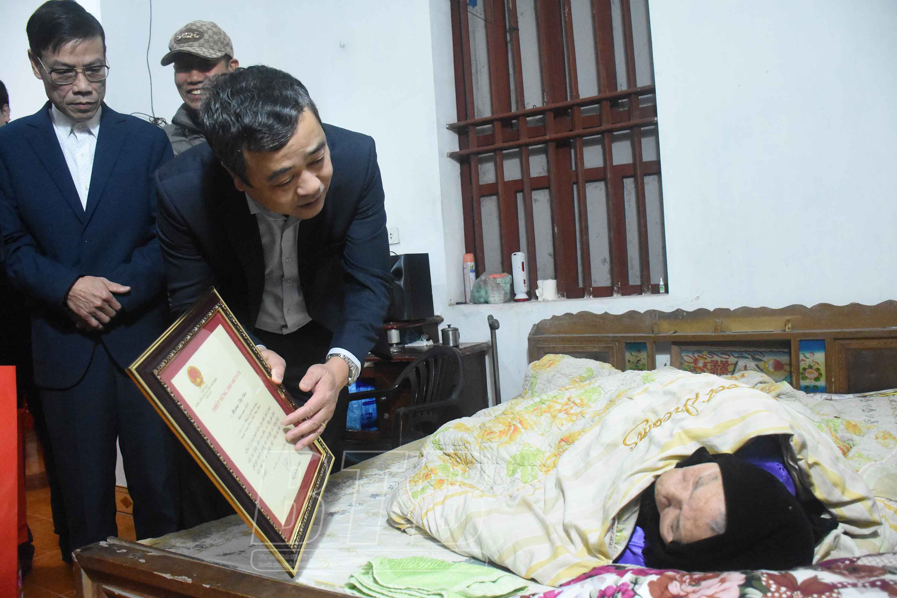 Đồng chí Bí thư Tỉnh ủy trao thiếp mừng thọ của Chủ tịch nước cho cụ Hoàng Thị Chứ.