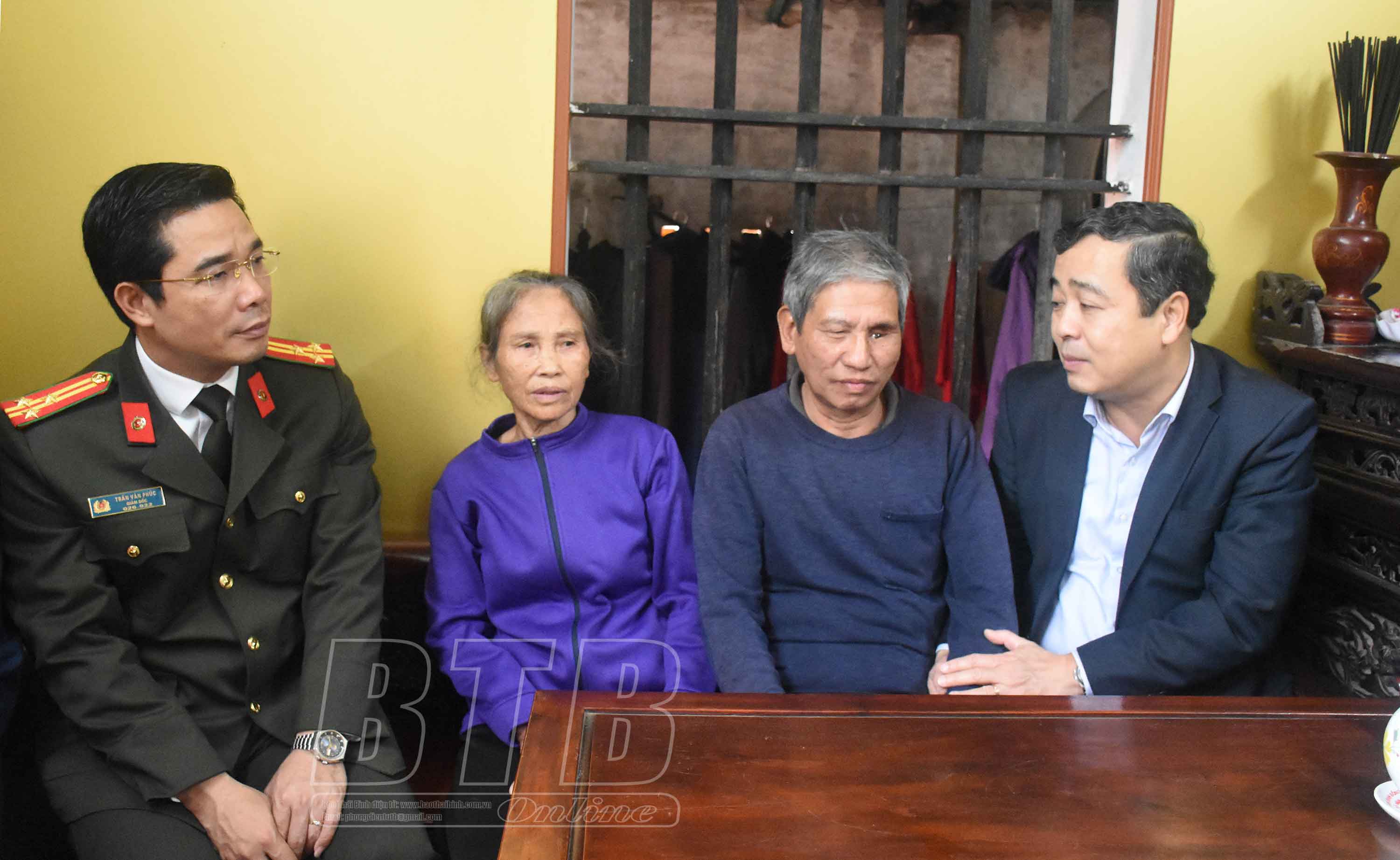 Cùng đi có các đồng chí: Thượng tá Trần Văn Phúc, Ủy viên Ban Thường vụ Tỉnh ủy, Giám đốc Công an tỉnh; Nguyễn Văn Huy, Tỉnh ủy viên, Phó Trưởng đoàn chuyên trách Đoàn đại biểu Quốc hội tỉnh; lãnh đạo Sở Lao động – Thương binh và Xã hội và huyện Đông Hưng.