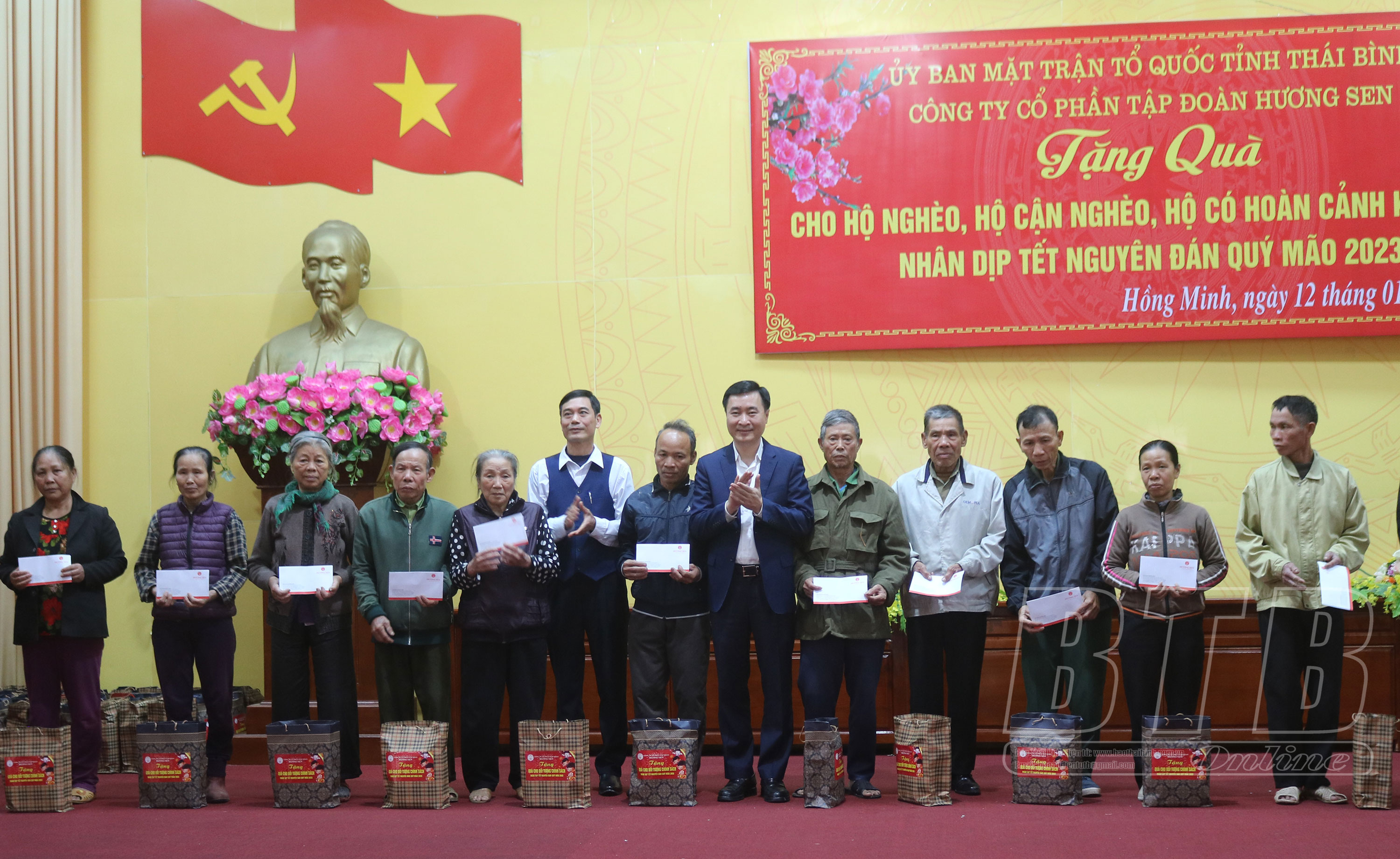Lãnh đạo Ủy ban MTTQ tỉnh và Công ty Cổ phần Tập đoàn Hương Sen trao quà tết cho hộ nghèo xã Thái Phương.