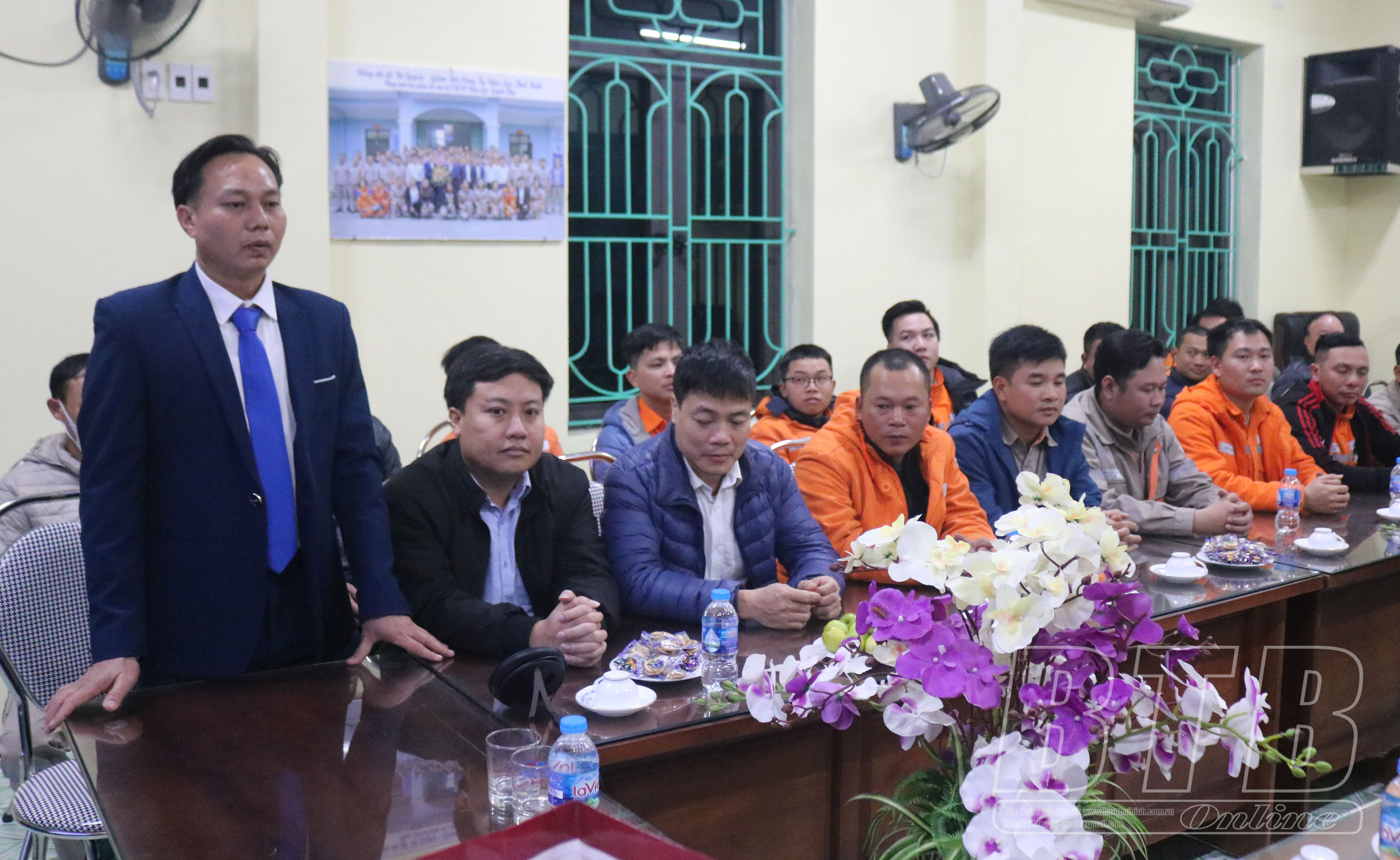 Lãnh đạo Điện lực huyện Quỳnh Phụ báo cáo công tác ứng trực bảo đảm nguồn điện cho người dân phát triển sản xuất và vui xuân đón tết. Ảnh: Nguyễn Cường