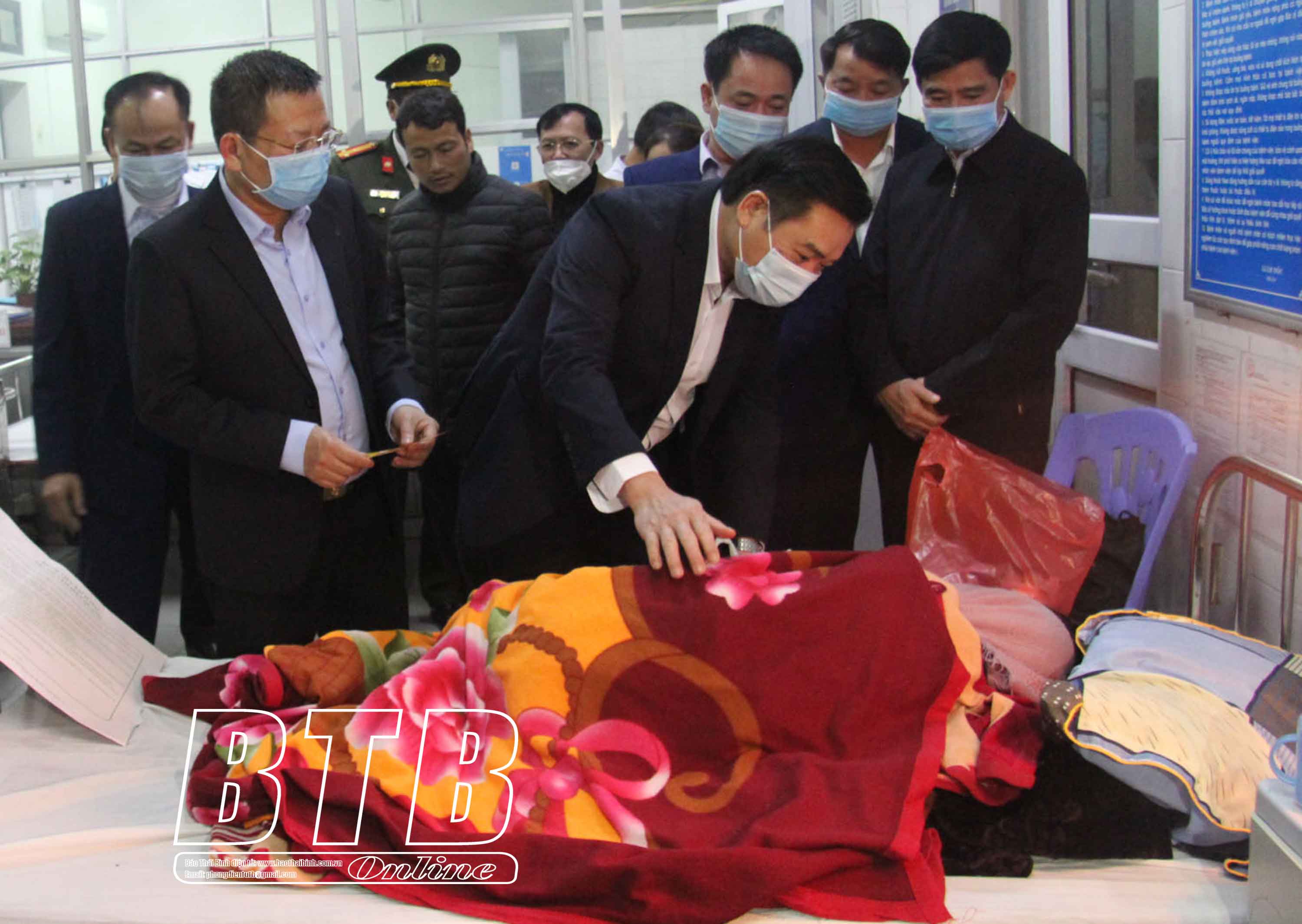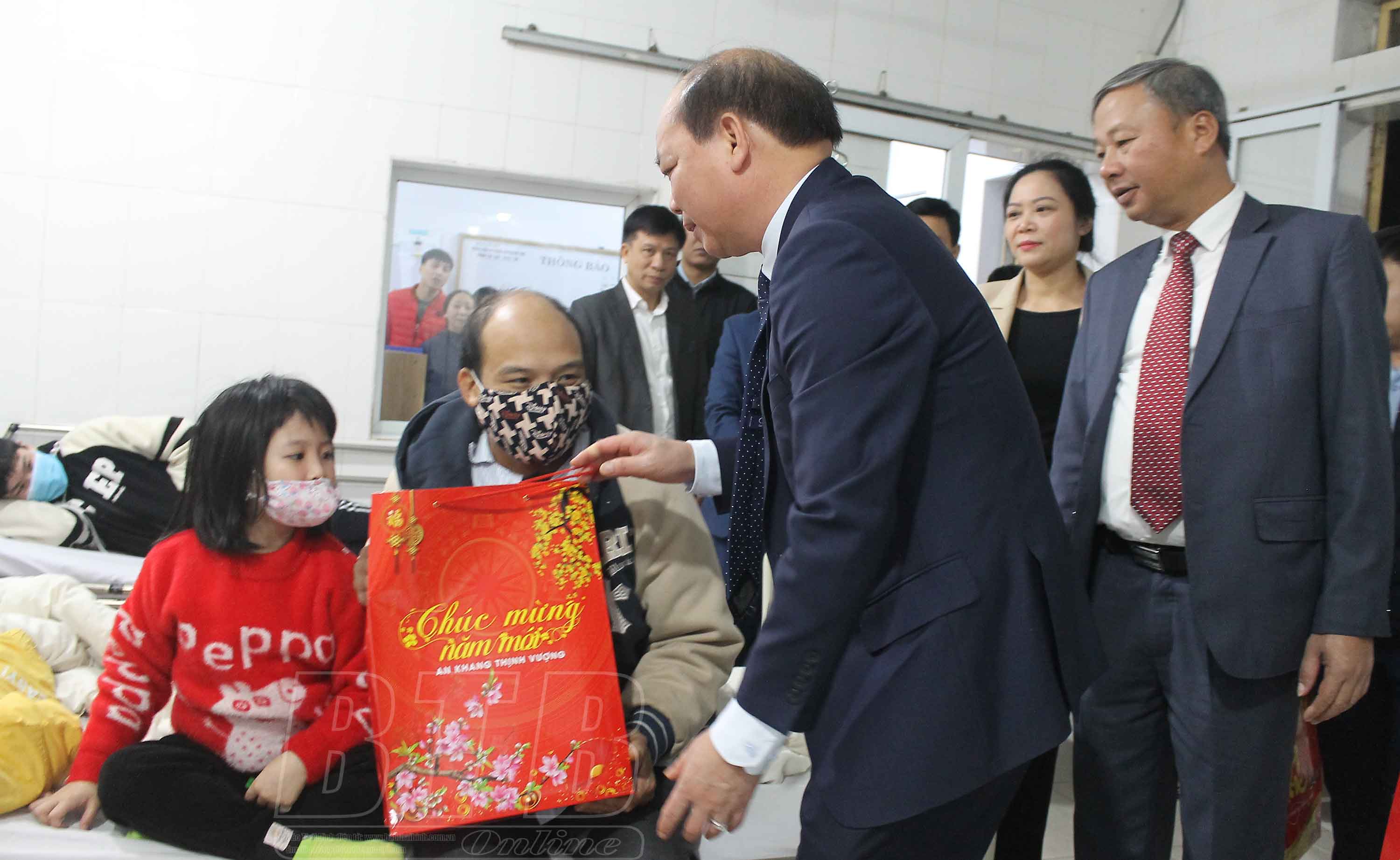 Đồng chí Đặng Thanh Giang, Ủy viên Ban Thường vụ Tỉnh ủy, Phó Chủ tịch thường trực HĐND tỉnh tặng quà cho bệnh nhân cấp cứu tại Bệnh viện Đa khoa huyện Vũ Thư. Ảnh: Quỳnh Lưu