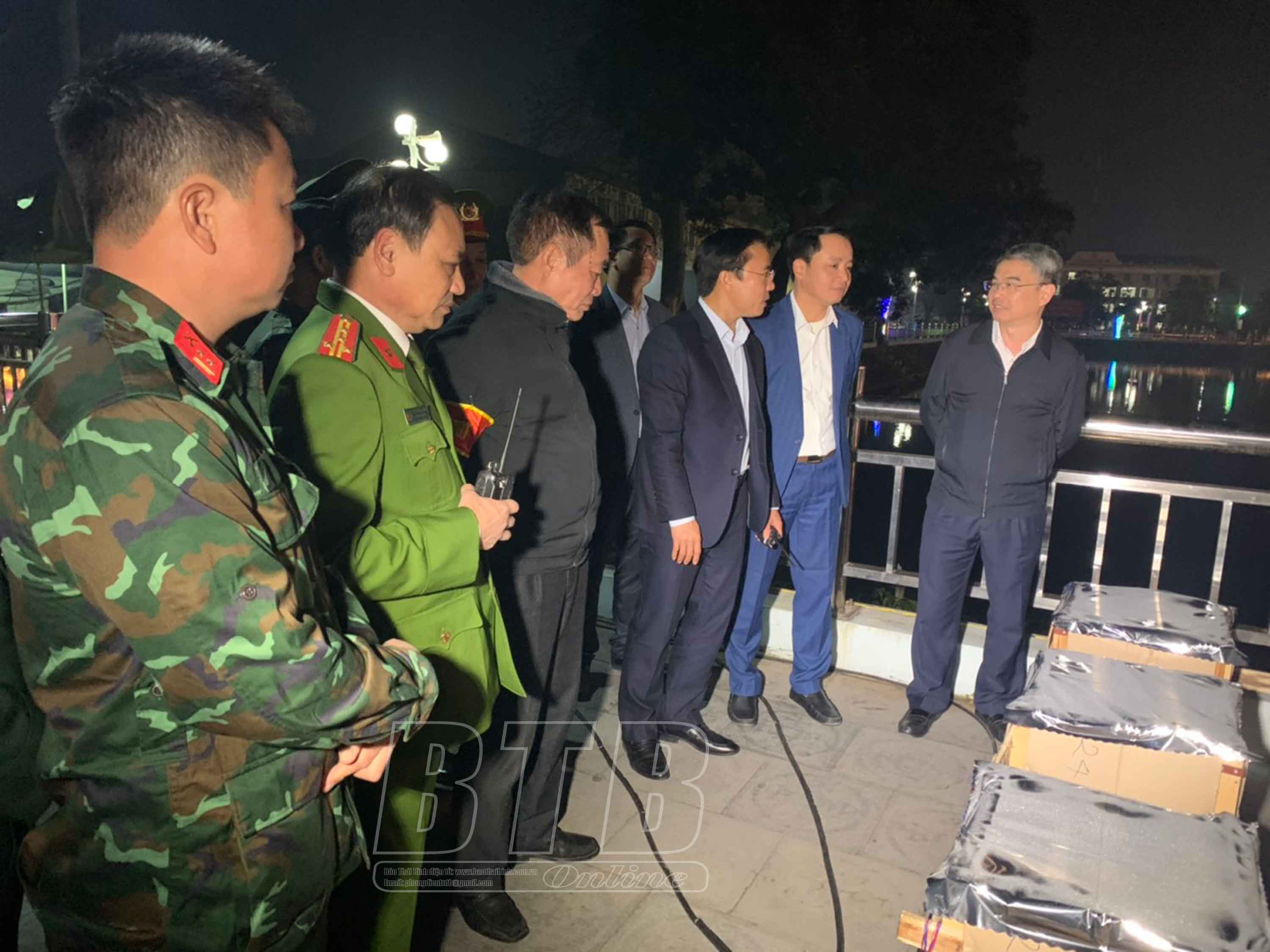 Đồng chí Phạm Đồng Thụy, Ủy viên Ban Thường vụ, Trưởng ban Tuyên giáo Tỉnh ủy kiểm tra trận địa pháo hoa tại huyện Kiến Xương. Ảnh: Thu Thủy