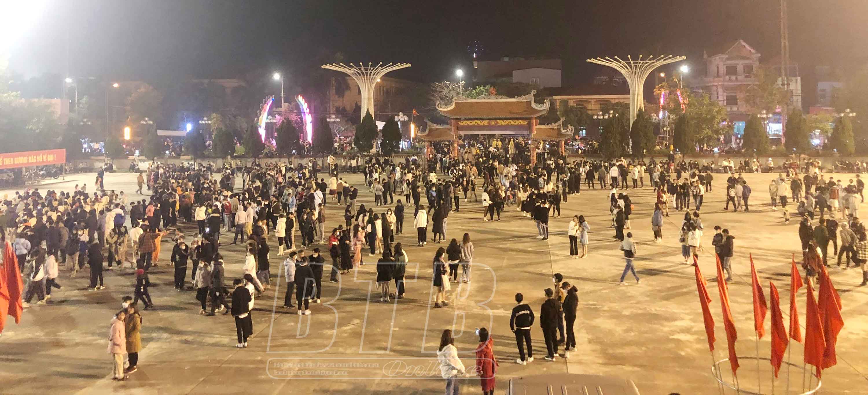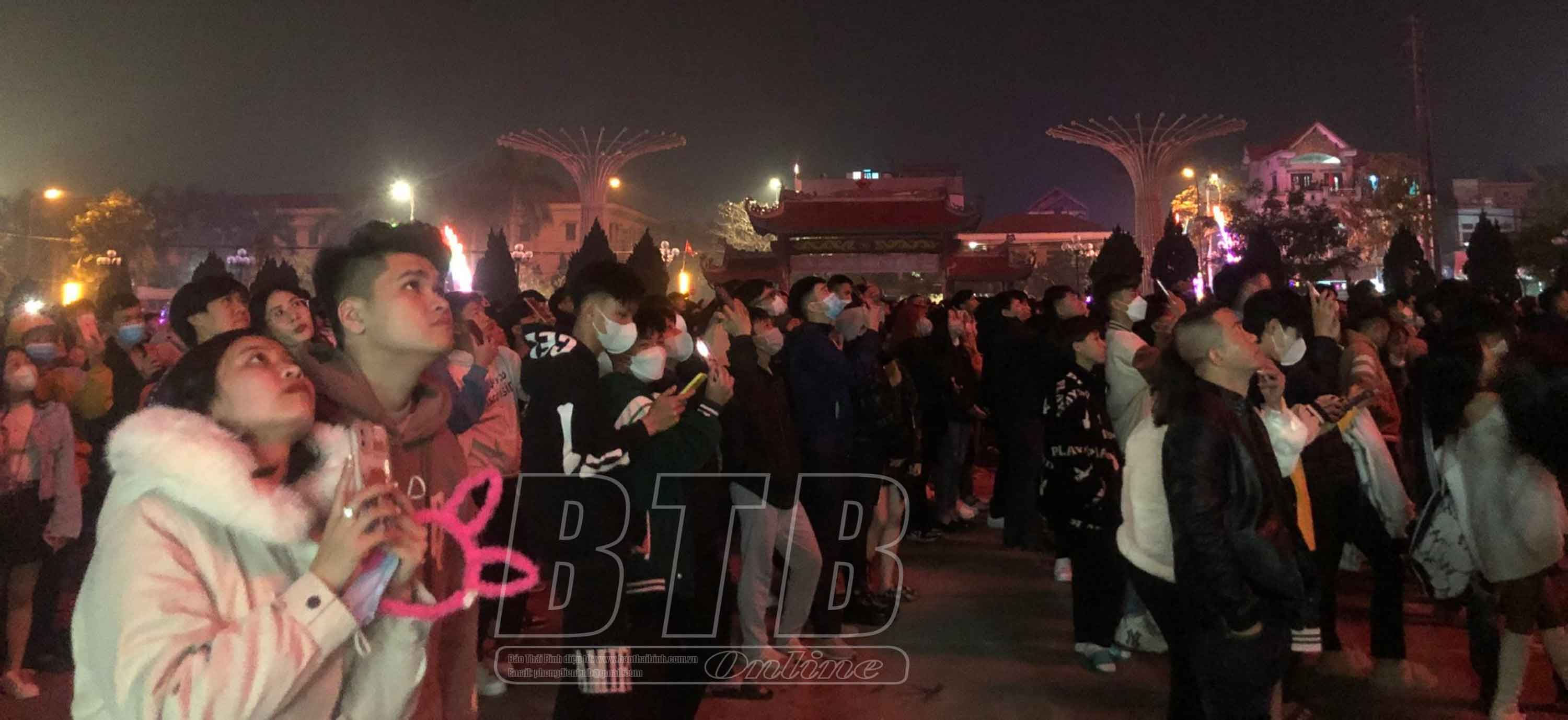 Người dân Hưng Hà xem bắn pháo hoa đêm giao thừa. Ảnh: Thanh Thủy