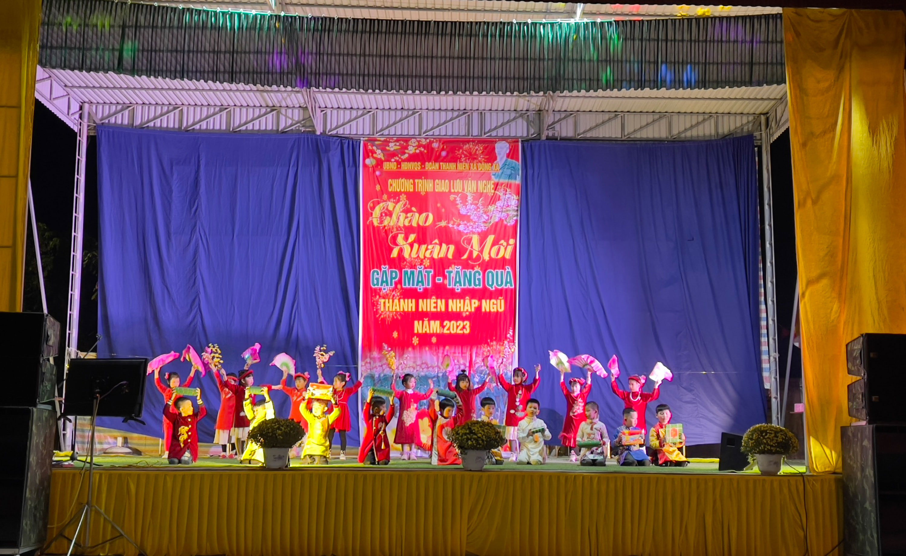 Các cháu thiếu nhi tham gia biểu diễn văn nghệ đêm giao thừa tại xã Đông Xá.