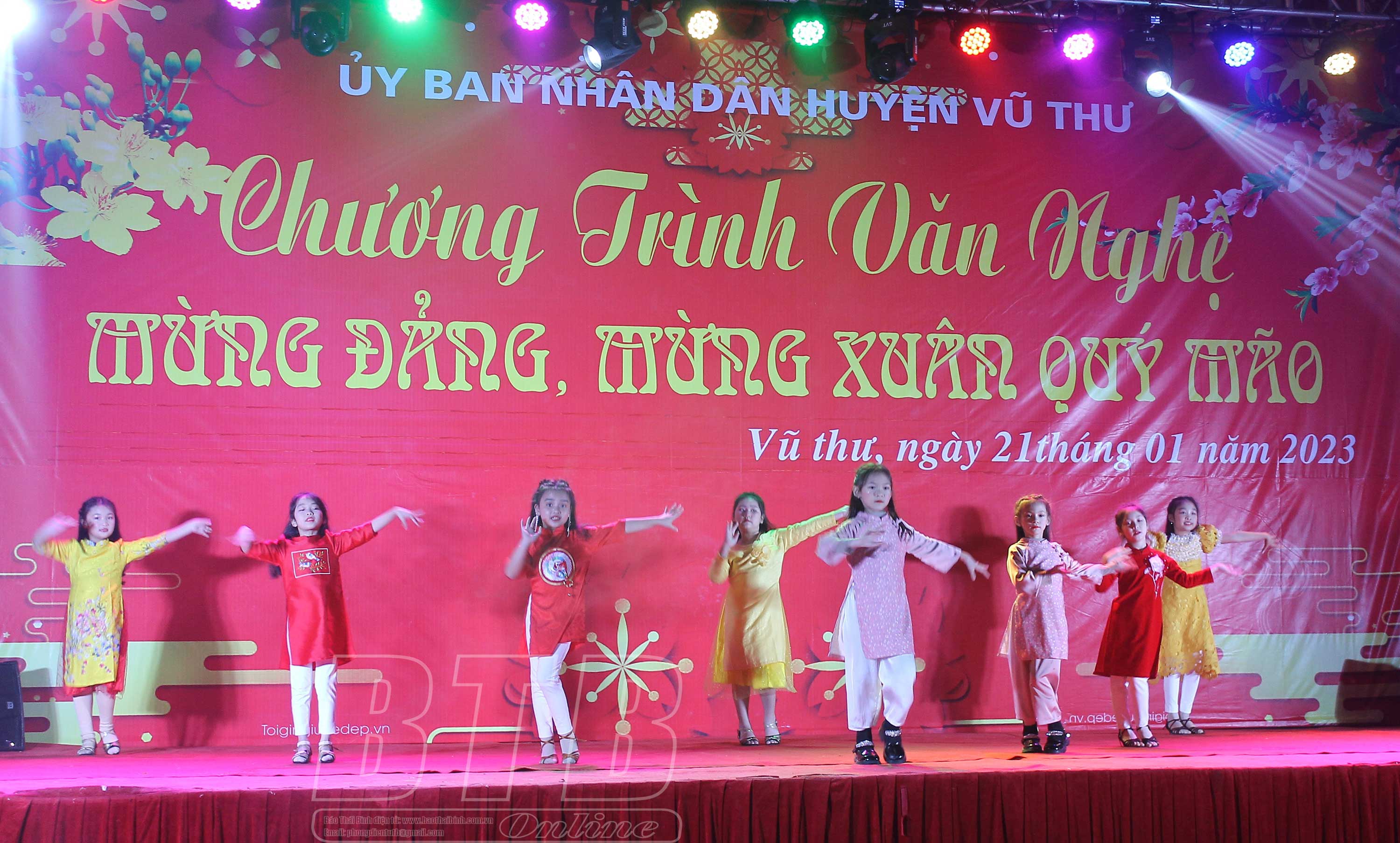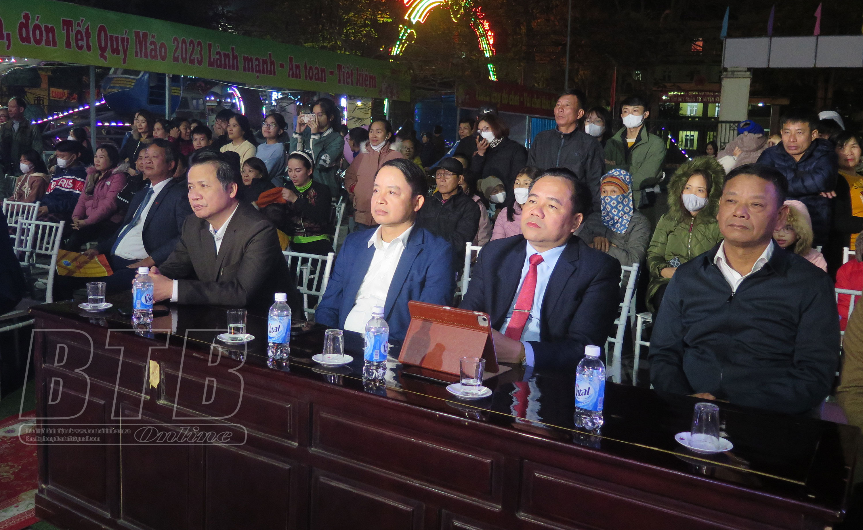 Chương trình văn nghệ chính thức bắt đầu từ lúc 21 giờ với chủ đề “Thành phố Thái Bình mừng xuân Quý Mão 2023” tại 2 địa điểm: Công viên 30/6, phường Trần Hưng Đạo và Công viên Kỳ Bá, phường Kỳ Bá. Chương trình gồm các tiết mục ca múa nhạc, ca ngợi Đảng quang vinh, Bác Hồ vĩ đại, hát về mùa xuân mới và ca ngợi mảnh đất con người thành phố Thái Bình. Trên địa bàn thành phố cũng diễn ra 3 địa điểm bắn pháo hoa. Gần 18 giờ tối, đèn đường đủ màu rực rỡ đã bật sáng tô điểm cho thành phố. 19 giờ, những đoàn người trong trang phục tết đã đổ về các địa điểm vui chơi, giải trí để ghi những hình ảnh của năm mới Quý Mão, cùng những ước nguyện cho năm mới an lành và tài lộc.
