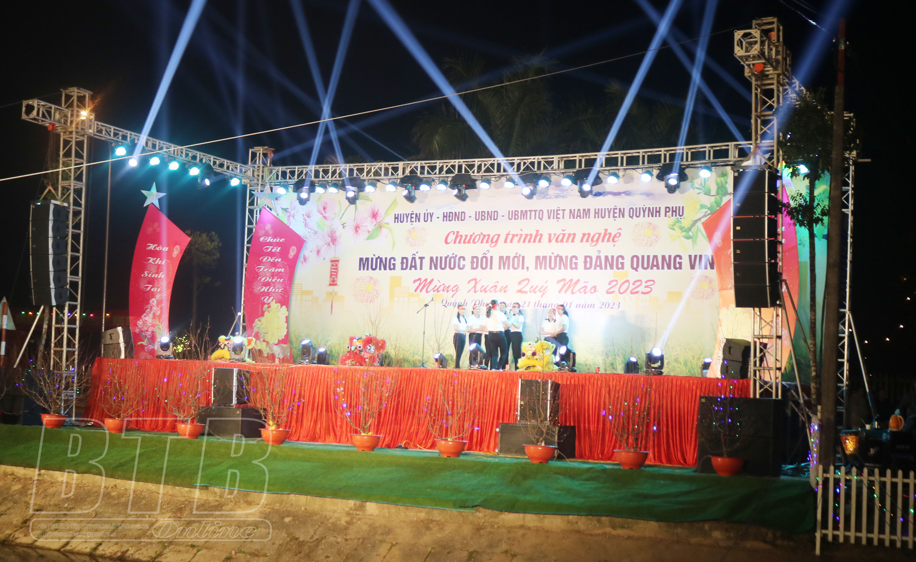 Đồng hồ chỉ 21 giờ 30 phút, thôn làng, khu, tổ dân phố ở 37 xã, thị trấn huyện Quỳnh Phụ đã đồng loạt tổ chức các hoạt động văn hóa, văn nghệ mừng Đảng, mừng xuân. Tại đường Đào Đình Luyện, thị trấn Quỳnh Côi – nơi được Huyện ủy, HĐND, UBND, Ủy ban MTTQ huyện Quỳnh Phụ chọn tổ chức chương văn nghệ với chủ đề "Mừng đất nước đổi mới, mừng Đảng quang vinh, mừng xuân Quý Mão 2023" và đây cũng là địa điểm được chọn tổ chức chương trình bắn pháo hoa trong đêm giao thừa.